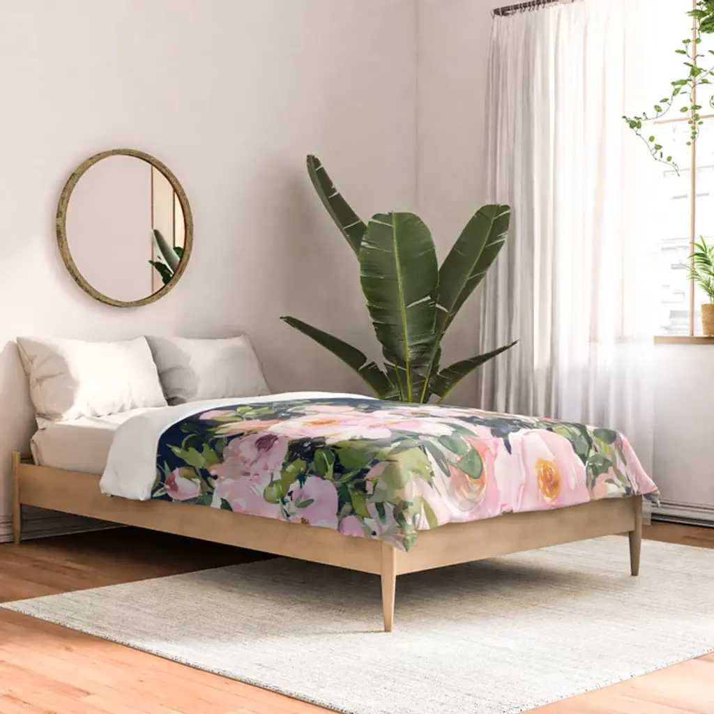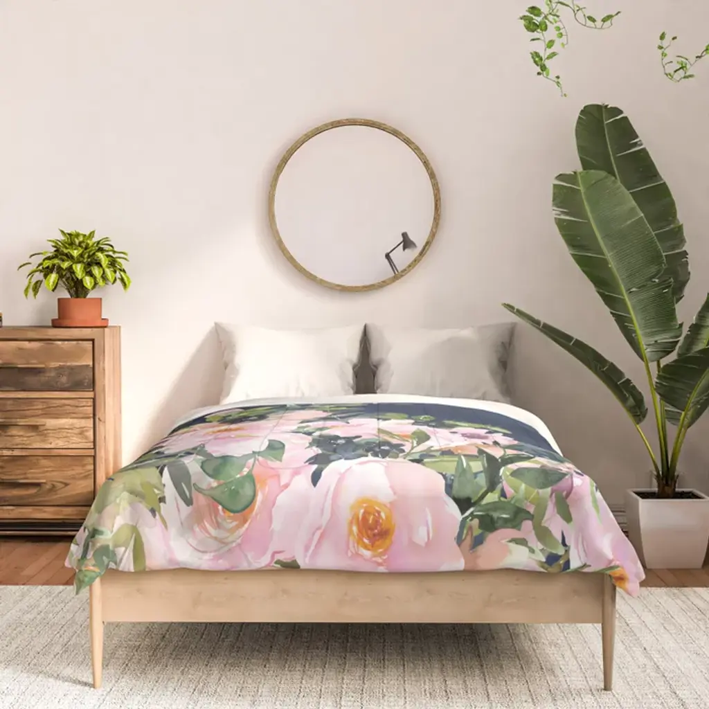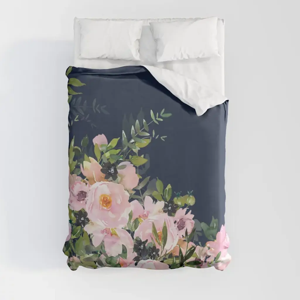 Boho, Floral Watercolor, Roses, Navy Blue And Pink Comforter