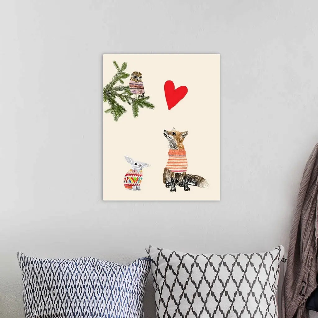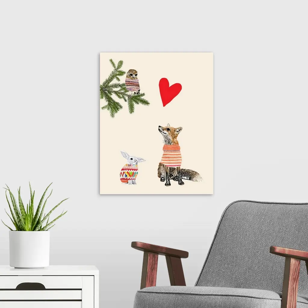Illustration of a fox, rabbit and owl wearing sweaters, and a red heart above.