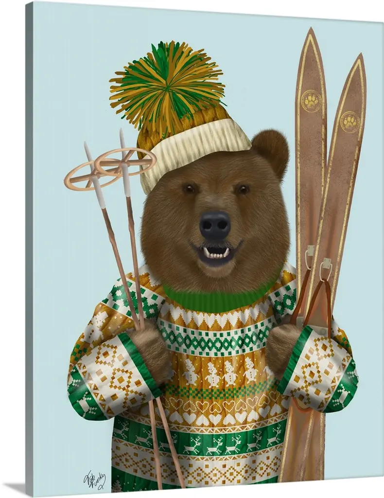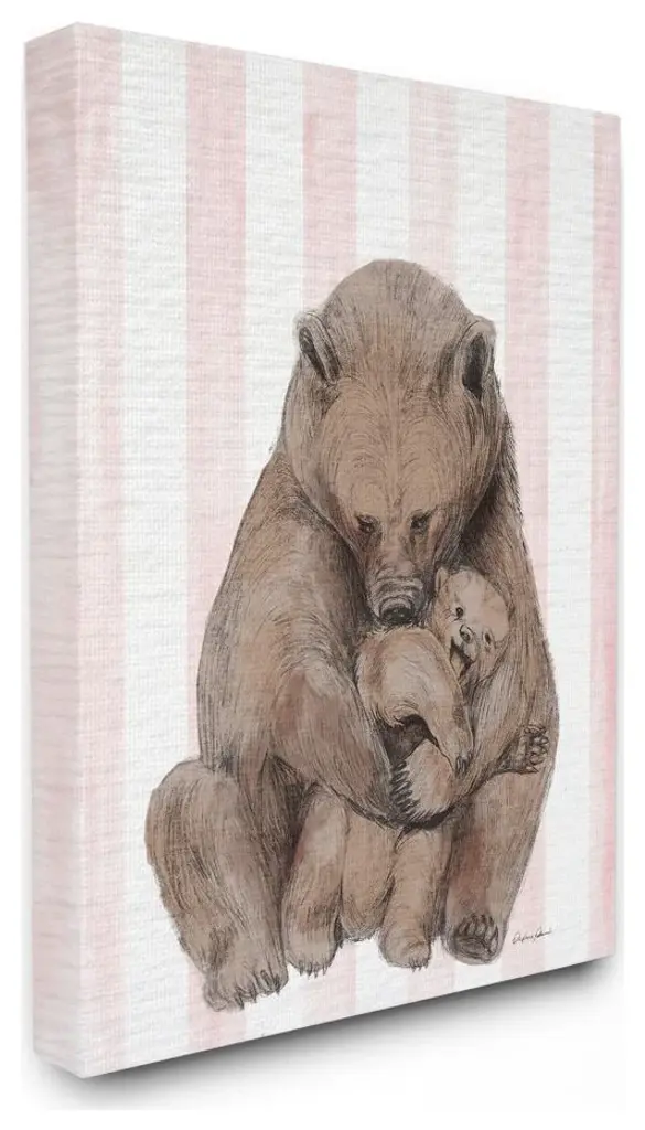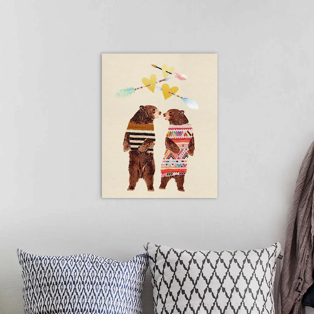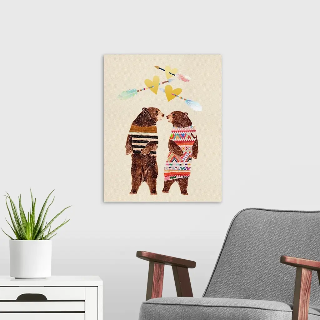 Illustration of a two brown bears wearing clothes facing each other, with arrows and hearts above them on a linen background.