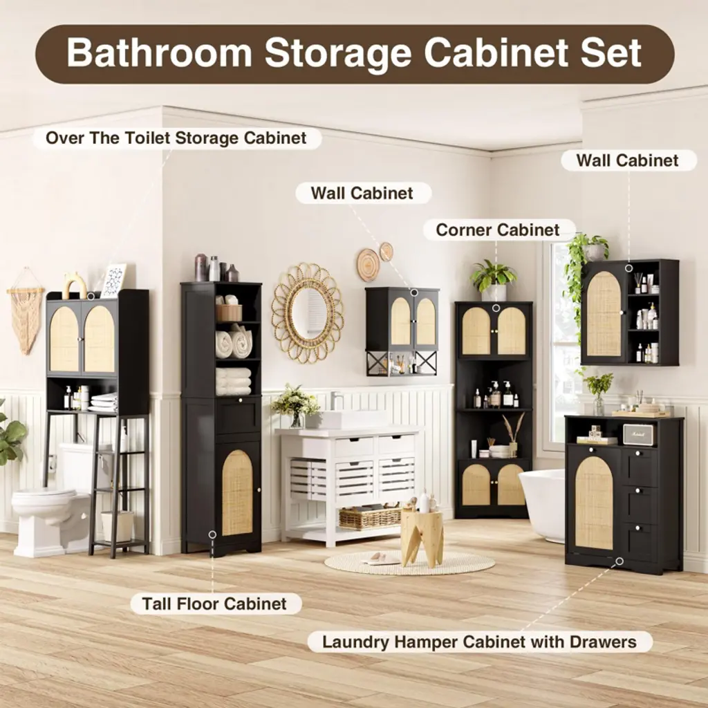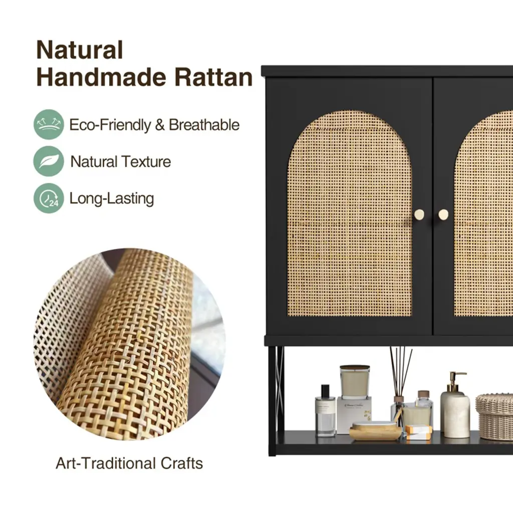 This wall-mounted storage cabinet, boasting a Bohemian vibe, features a handmade arched rattan door, open shelf, wave wood grain, and plant accents, blending natural beauty and cultural charm. Crafted with sturdy P4 board, it offers ample storage for towels, toiletries, etc., with open shelves for display. Reinforced by anti-tip accessories, pivot doors, and magnetic stops, it’s stable and durable. Easy to assemble with labeled panels and instructions; customer support available.