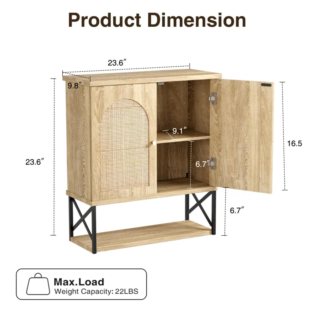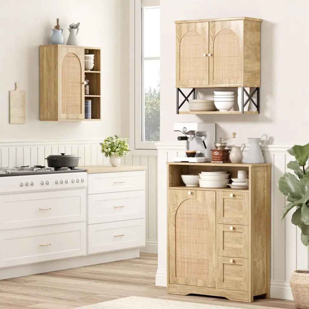 This wall-mounted storage cabinet, boasting a Bohemian vibe, features a handmade arched rattan door, open shelf, wave wood grain, and plant accents, blending natural beauty and cultural charm. Crafted with sturdy P4 board, it offers ample storage for towels, toiletries, etc., with open shelves for display. Reinforced by anti-tip accessories, pivot doors, and magnetic stops, it’s stable and durable. Easy to assemble with labeled panels and instructions; customer support available.