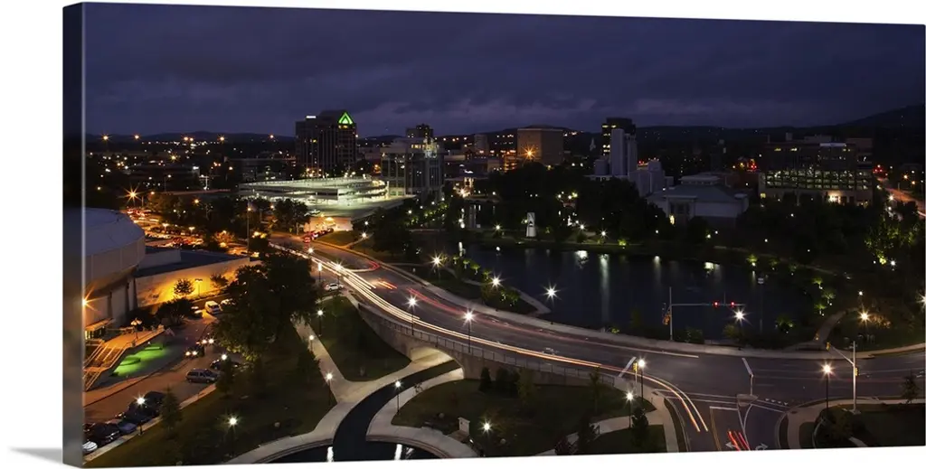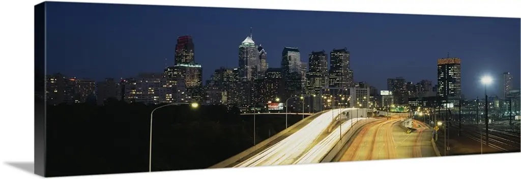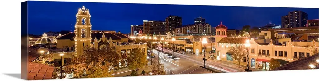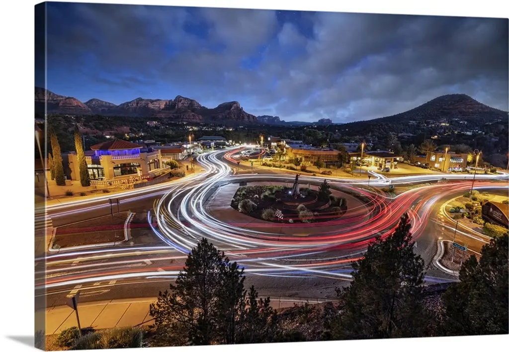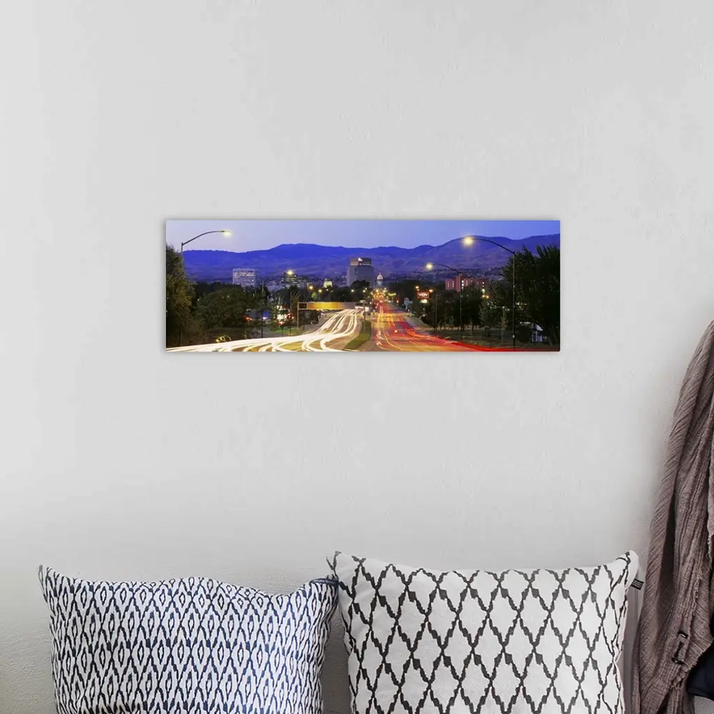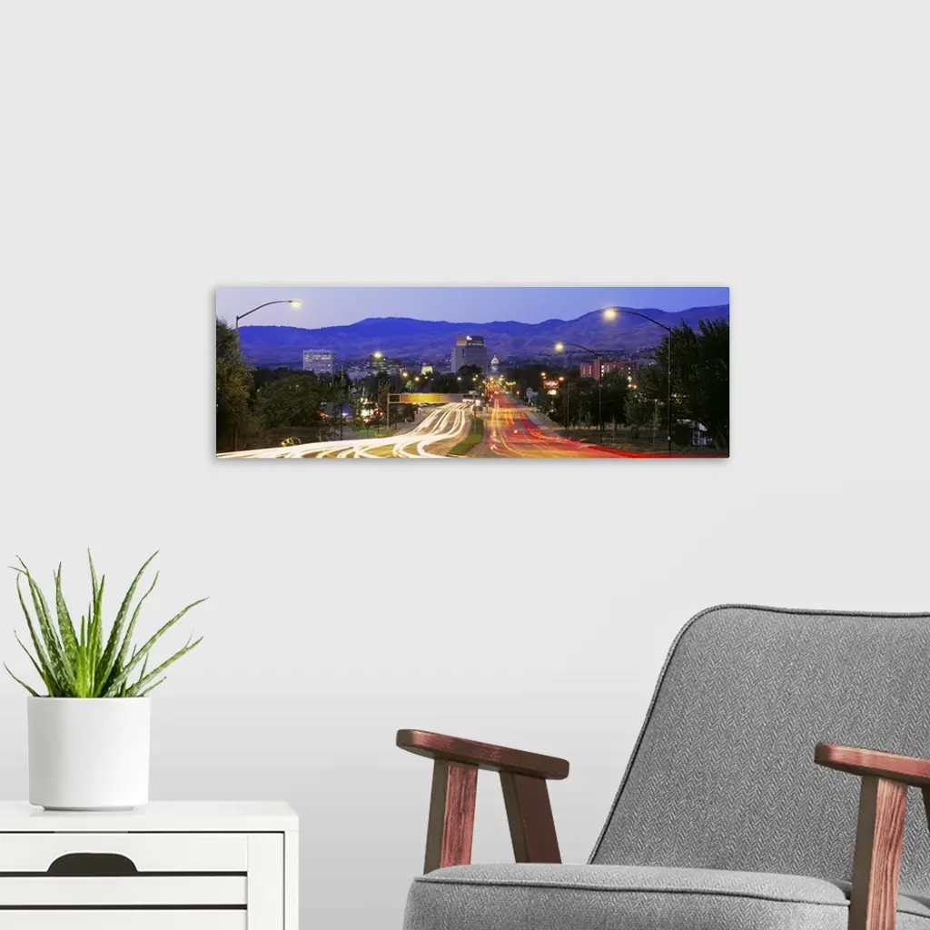 Panoramic photograph taken of a major highway in Boise with the lights of the cars shown as streaks on the road.