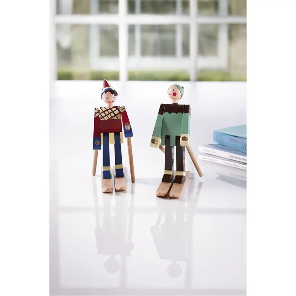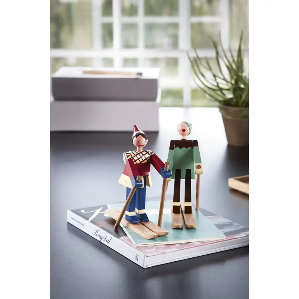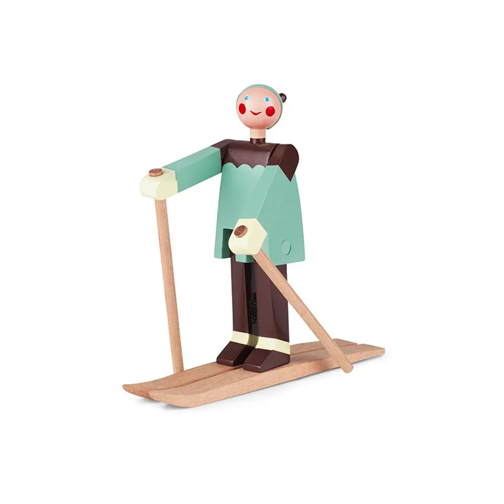 Datti and Boje are cheerful skiing wooden dolls that Kay Bojesen designed in the 1940’s. The red-cheeked characters were named after his family members – his son Otto was called Boje, and Datti was the nickname of his daughter-in-law Ruth. The dolls are made of beech and feature skis, skiing poles and outfits painted with vibrant colors.
