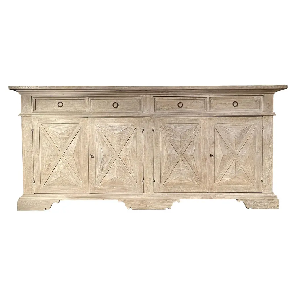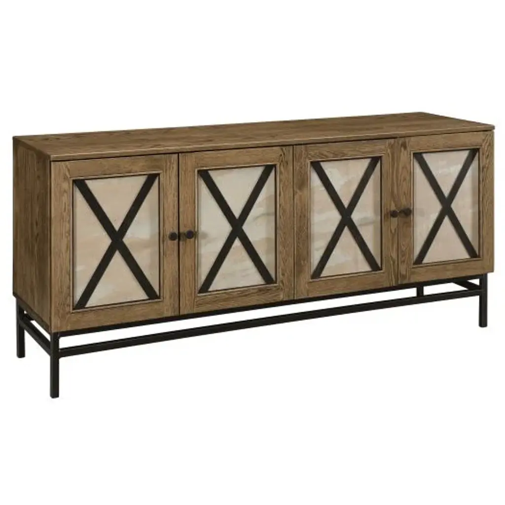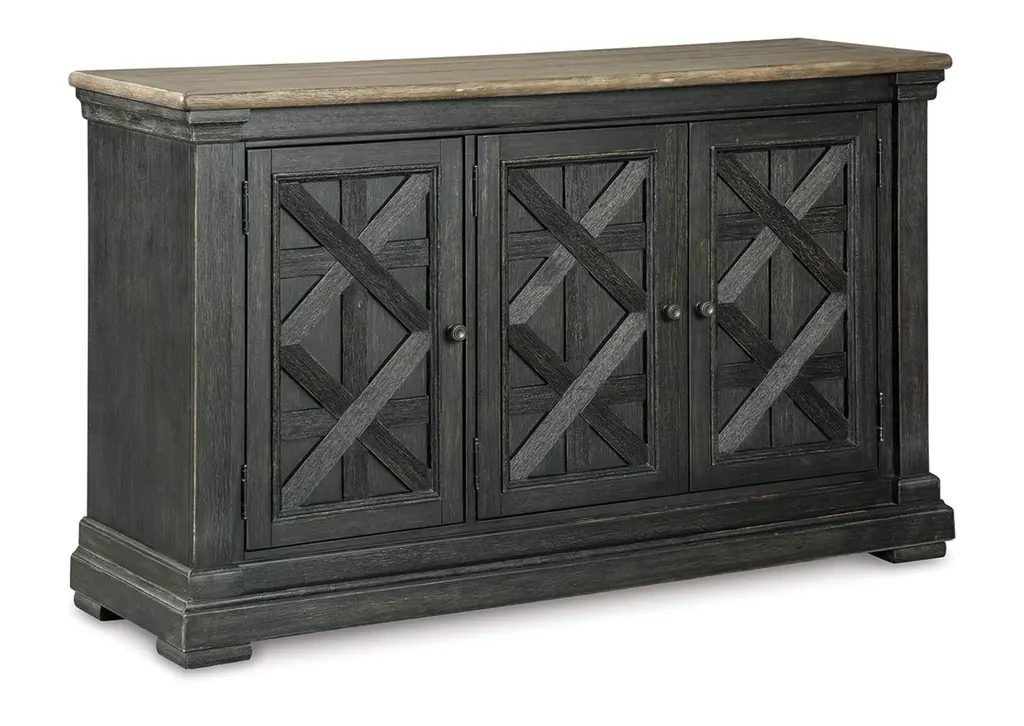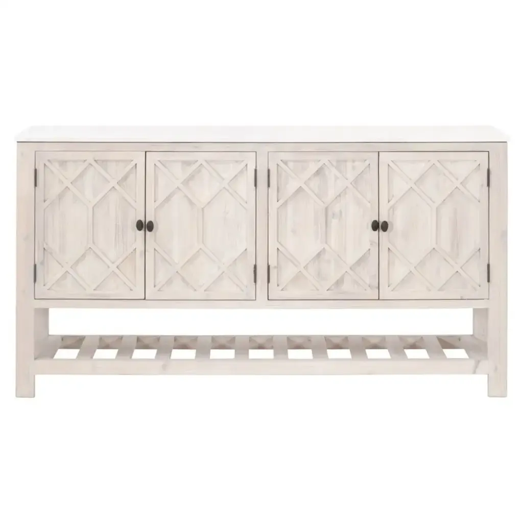 Adding a little farmhouse flair or shabby chic is easy with this beautiful server. Boasting two adjustable shelves for ample storage and a spacious top that's perfect for display or as a buffet setting. With an antique white finish, latticed doors and a planked top with a weathered oak finish, it oozes style and charm.