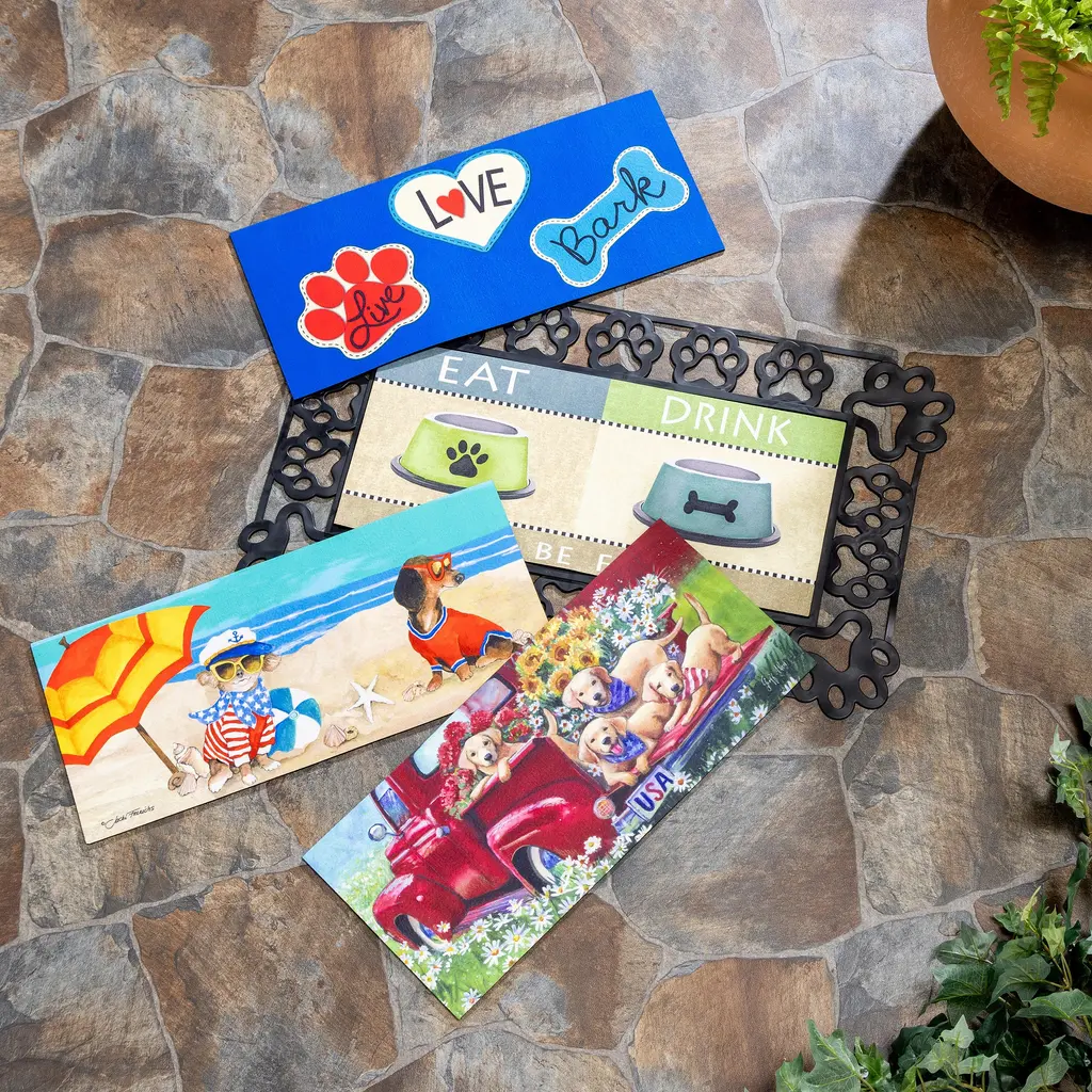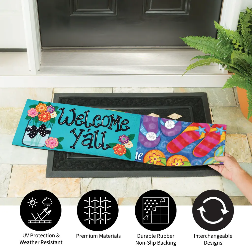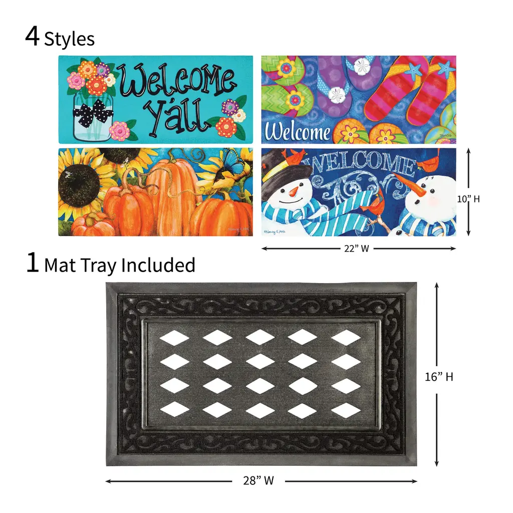 This Bold and Bright Four Season Sassafras Mat Set is the perfect way to dress up your doorstep all year round. Convenient set includes four Sassafras Switch Mats - one for each season, spring, summer, fall and winter. Each design adds vivid, eye-catching color to your entryway. These durable and vibrant doormats make seasonal decorating a breeze thanks to the included base tray. Sassafras mats are constructed of durable rubber for a non-slip grip and extra protection against the elements. Now you can get a stunning seasonal selection of these top sellers in one convenient set. Easily change the look and feel of any space and update your décor by simply changing mats.