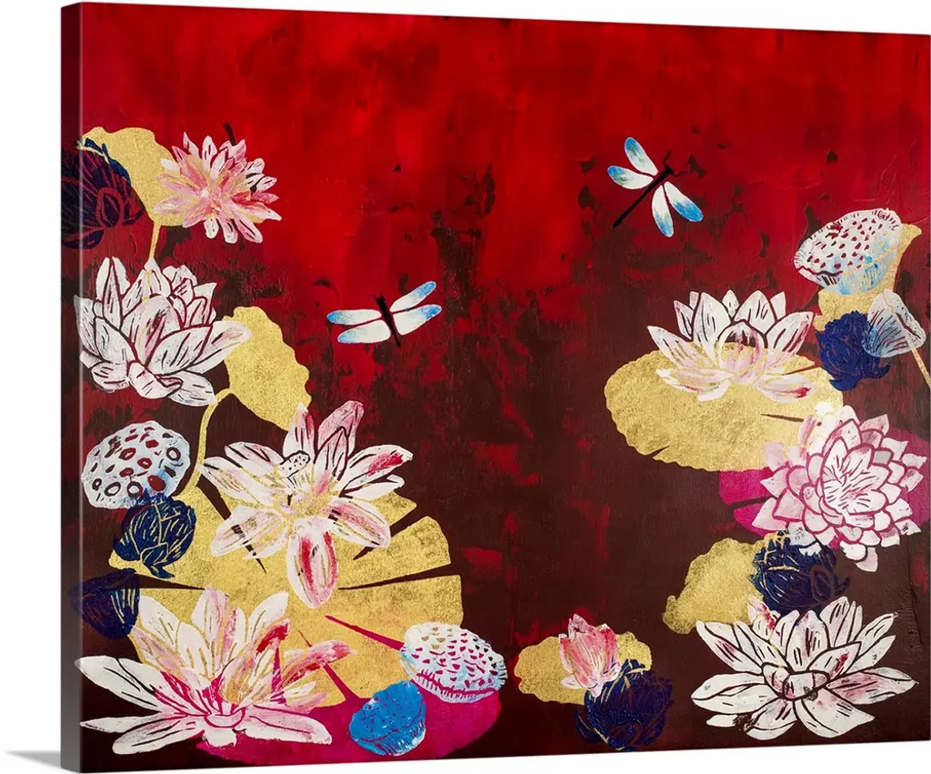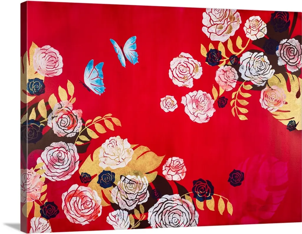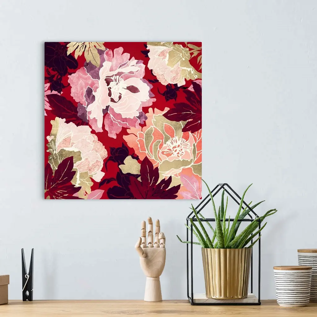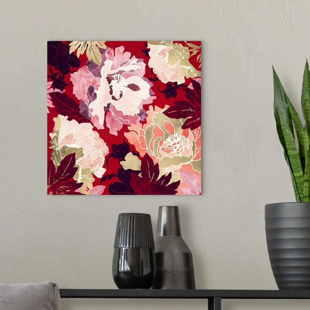 Abstract floral design with crimson, red, pink, gold and leaves.