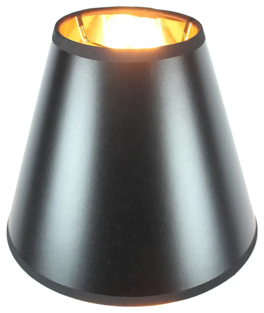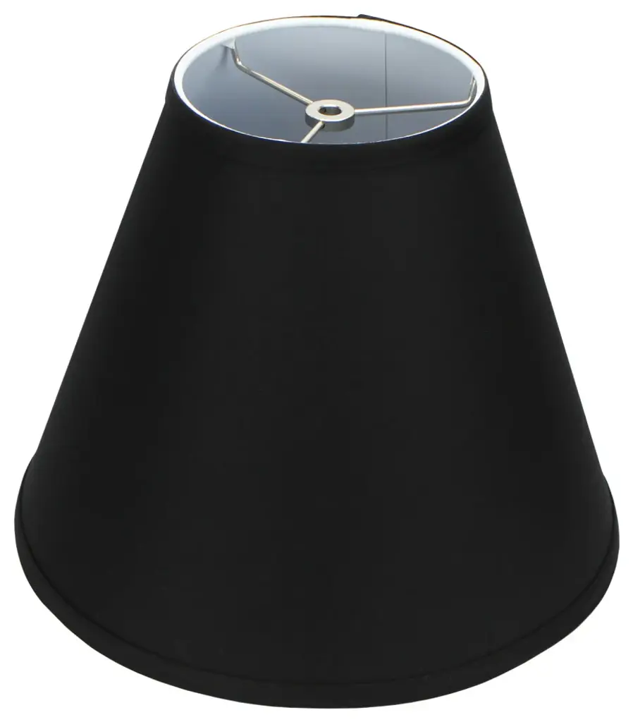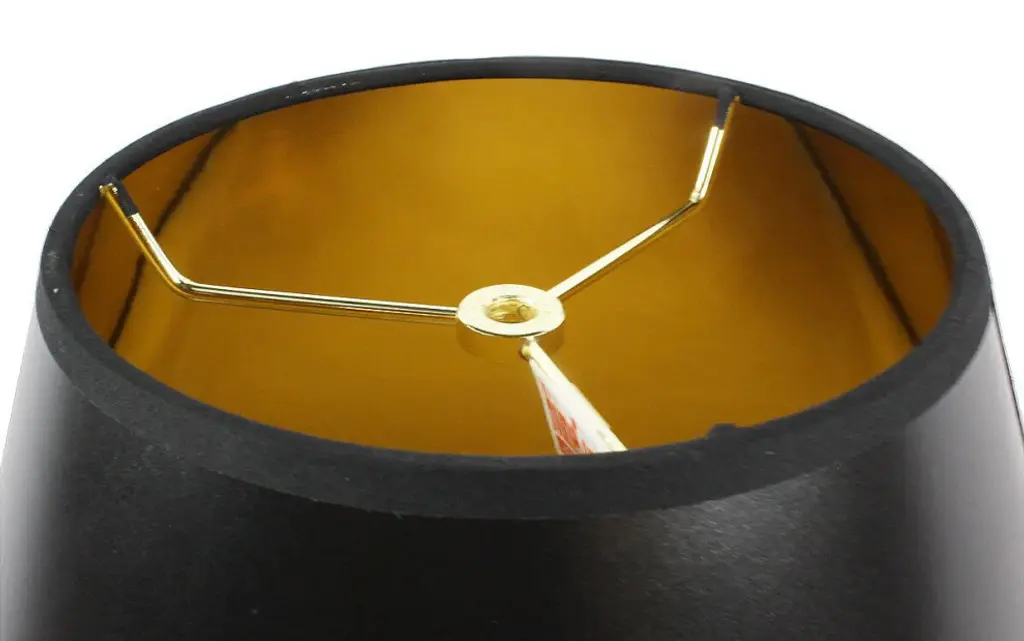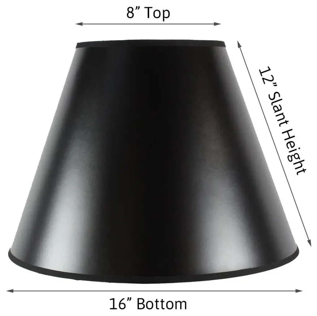 Home Concept Signature Shades feature the finest premium hardback parchment. Durable parchment means your new lampshade will last for decades. It wont get brittle from smoke or sunlight like less expensive paper shades. Heavy brass and steel frames means your shades can withstand abuse from kids and pets. It''s a difference you can feel when you lift it. This hardback empire shade has a black with gold lining. The dark blocks most light from illuminating the shade, but the gold lining reflects the light up and down to light up the space. Black Gold-Lined paper, an elegant addition to your home Handcrafted by experienced designers, each shade is unique Top quality lampshade, popular with designers and hotels Heavy brass and steel frames mean you can feel the difference when you lift it. Why? Because your home is worth it! Product details: This hardback empire shade has a black with gold lining thick finish. The dark finish blocks most light from illuminating the shade, but the gold lining reflects the light up and down to light up the space. Thick Bold Black with Gold Lining Finish Shade Dimensions: 8 Top x 16 Bottom x 12 Slant Height Please measure your existing shade, a new harp may be needed for a proper fit. Shade has a1 Spider Drop Fits best with a 10 harp.