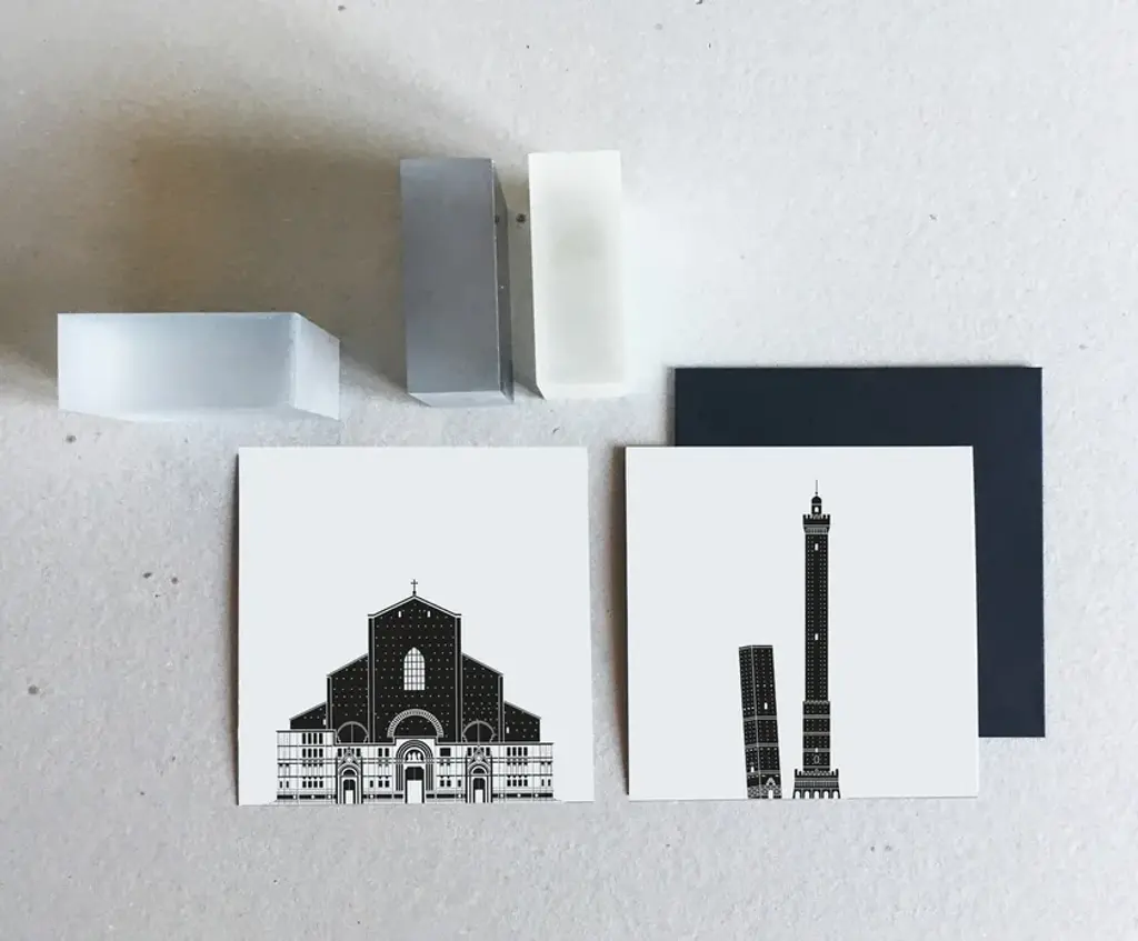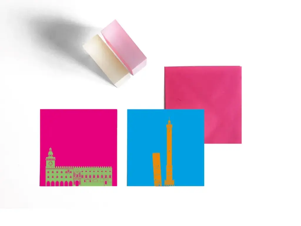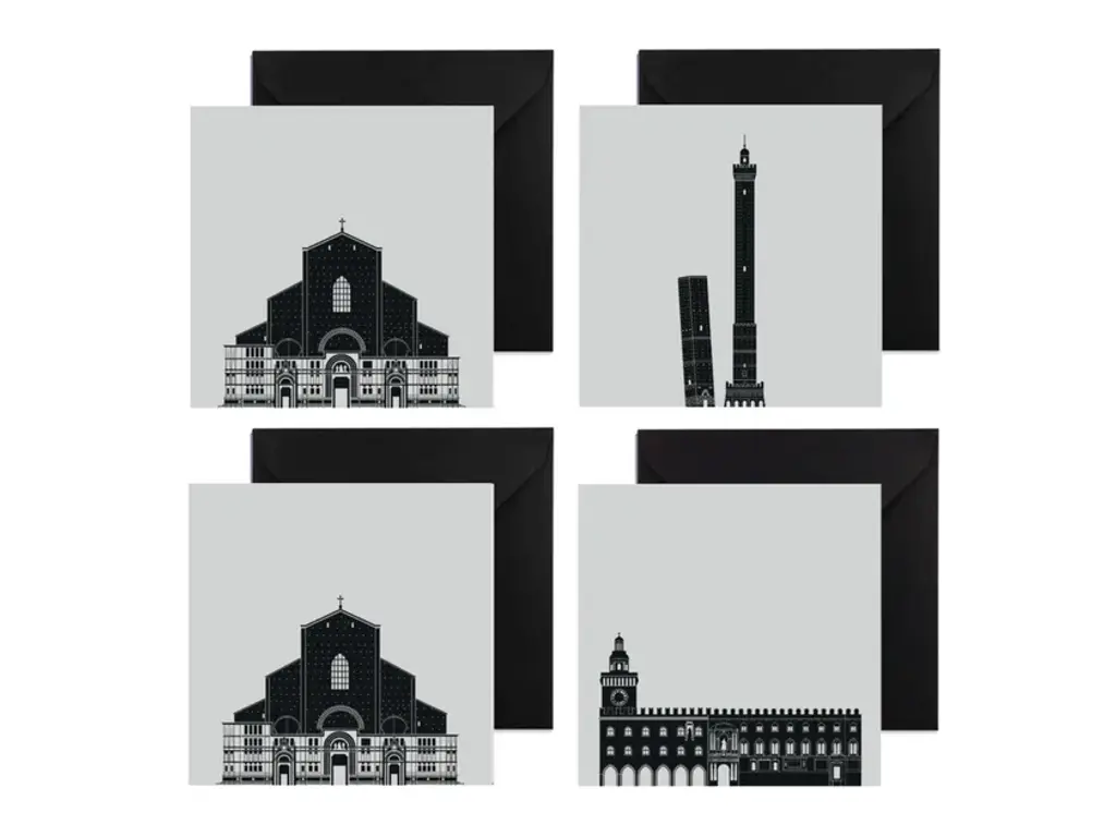 Kit made of paper containing 4 greeting cards with envelopes, graphics dedicated to the main monuments of the city of BOLOGNA. Available in color and gray versions.