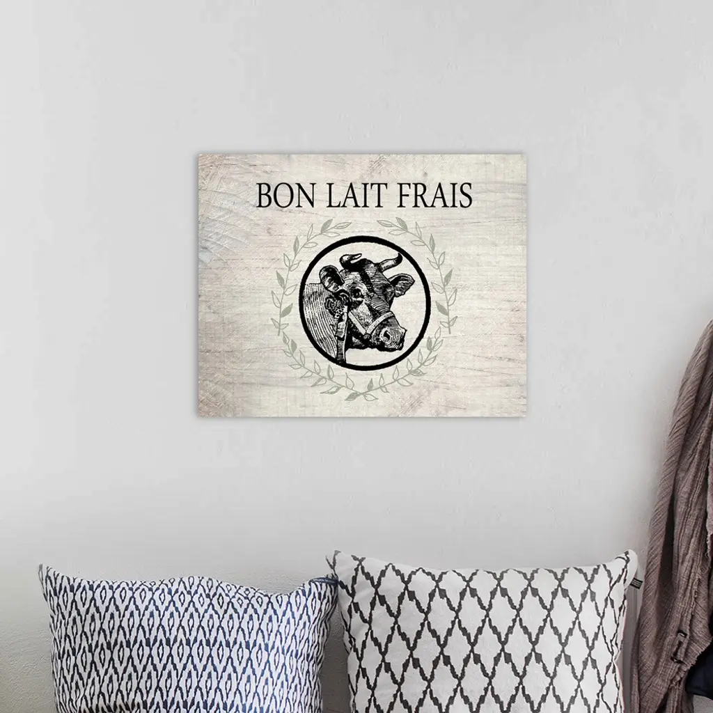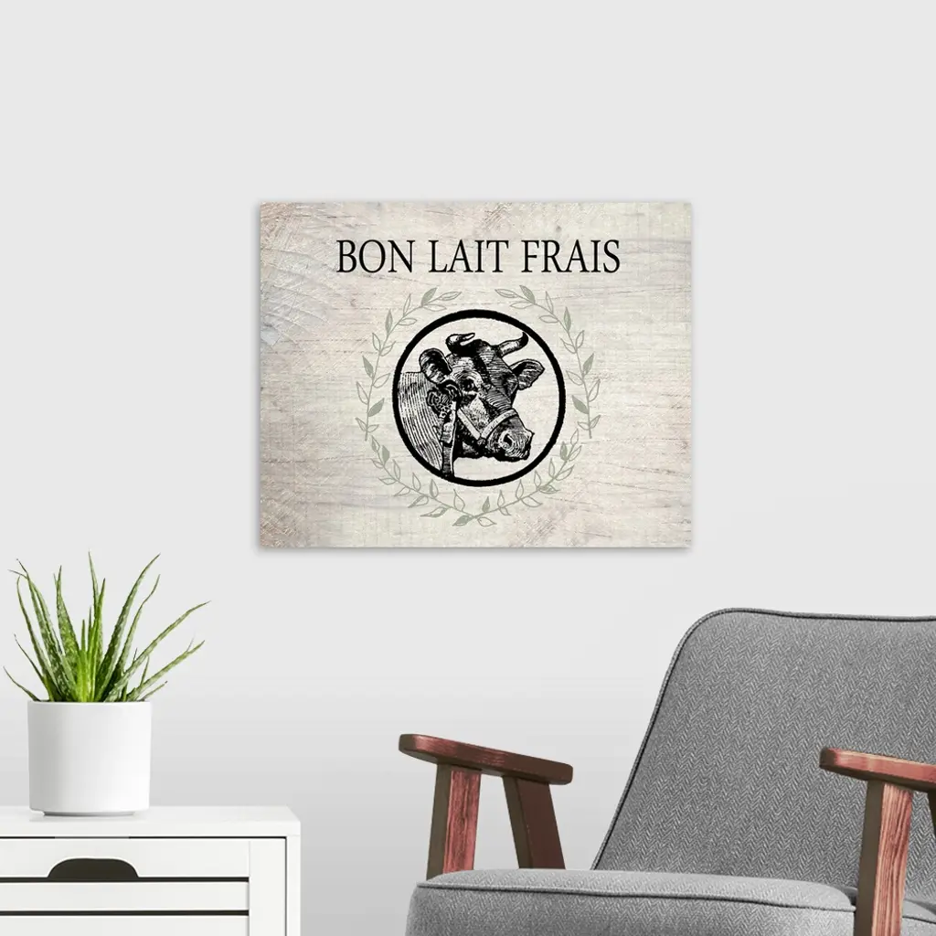 "Bon Lait Frais" with a cow surrounded by a wreath on a wood textured background.
