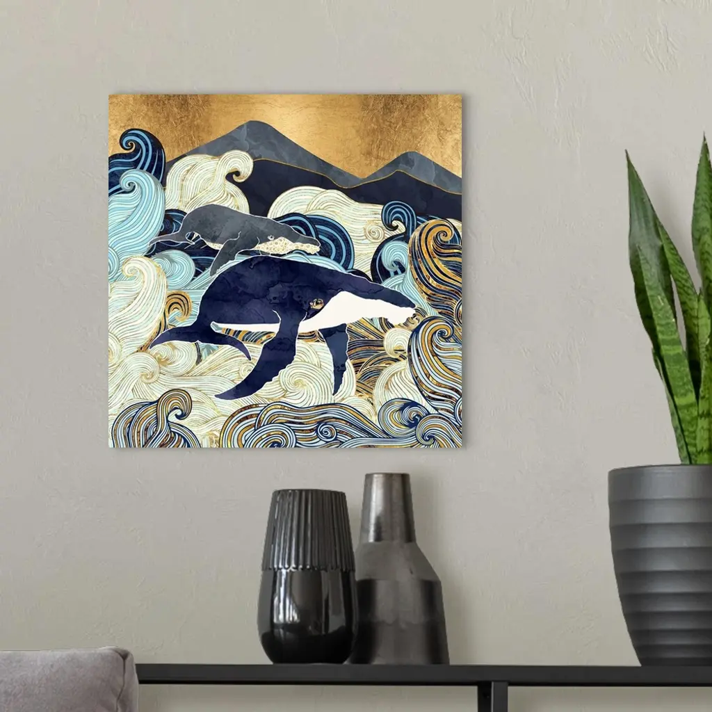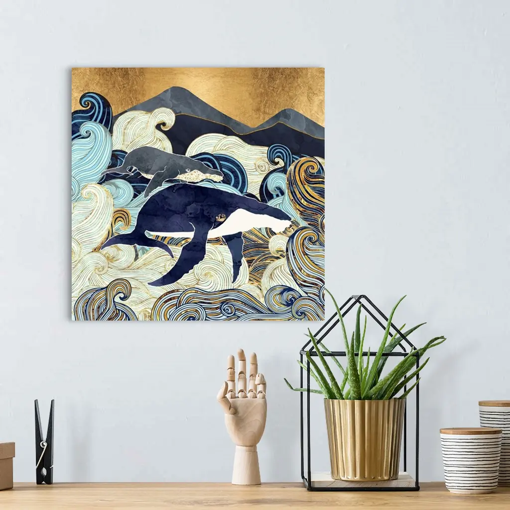 Abstract depiction of whales, waves, mountains, gold, blue and white.