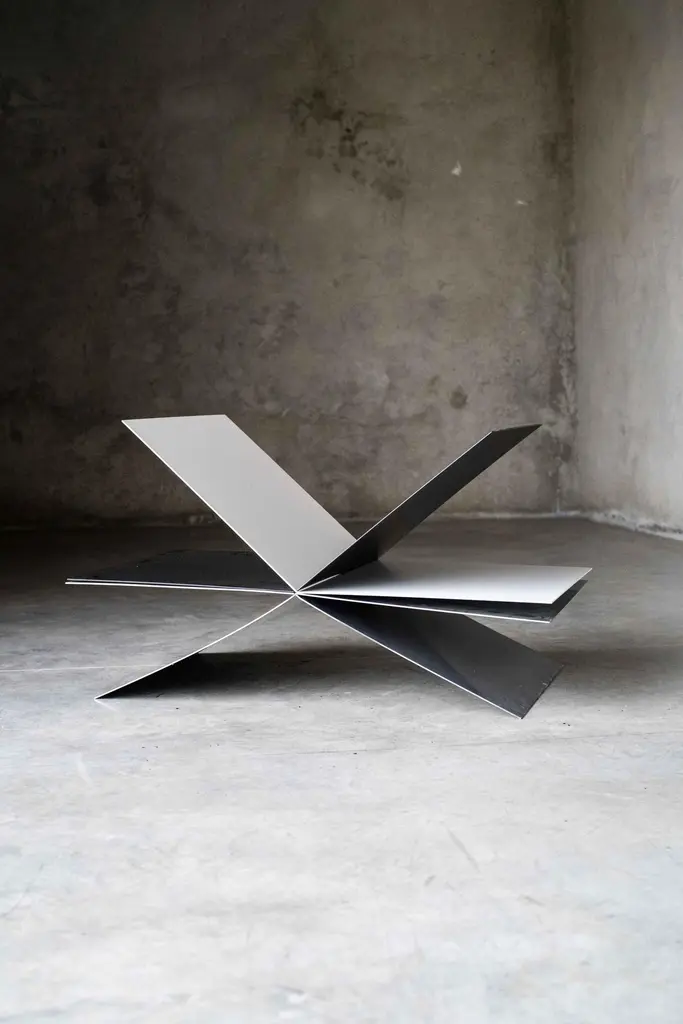 Book table by MOB Limited editions of 15 + 1 prototypeDesigner: Fernanda Fragateiro (Portugal)Dimensions: H 100 x D 57 x W 70 cmMaterial: 10mm steel sheet, black and white powder coating, Eco-chrome paintingThinking of a table to place the books I’m reading, a three-dimensional composition emerged from planes that intersect and create a movement in space that suggests the act of flaying the pages of a book.MOB is an international design incubator that develops furniture projects designed by artists and architects.Based in Lisboa and Santiago de Chile, MOB aims to invite young creators from different parts of the world to present proposals that confront their points of view around a piece of furniture. Through exercises based on their own local realities, these pieces are located in a global scene and then finally return to the intimate context of their daily use. MOB invites creatives with both emerging and established careers, always under the premise of looking for fresh and particular voices with their own style and challenging their contexts. In this way, they want to materialize personal research into products capable of transmitting the complexity of social and formal thinking.MOB aims to produce commercial pieces that establish connections capable of developing crossovers between multiple places, creators, users, and ideas, through a production model based on commissioning design by invitation, manufacturing and distributing certificated limited editions by MOB ensuring high production standards.