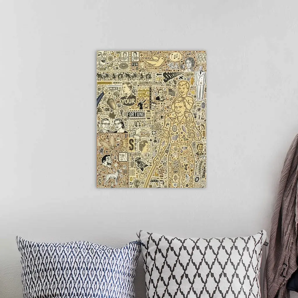 Mixed media abstract art with hundreds of found elements, including text, illustrations, and symbols.