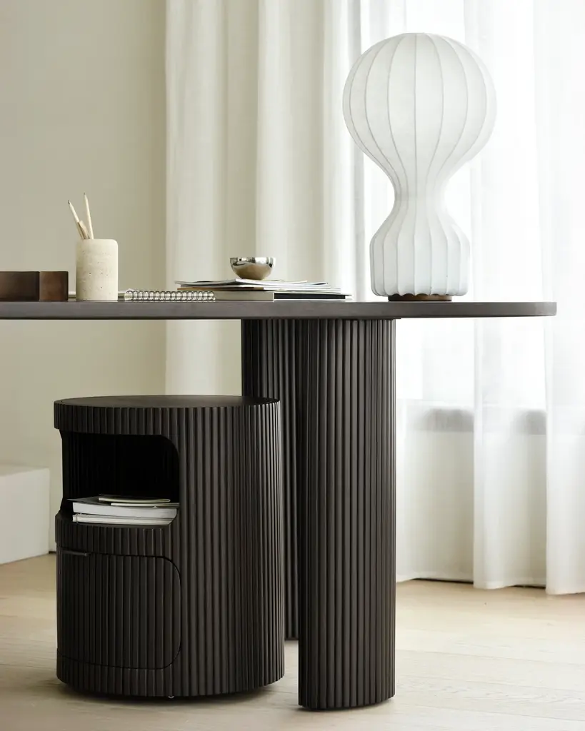 Inspired by shapes found in nature, the Boomerang collection features a playful, pebble top set on curved legs with a stacked, wood stick effect. Featuring hand-carved details and the practicality of wheels, the Boomerang drawer unit can serve many purposes, fitting perfectly under a desk for extra storage or as a standalone piece.