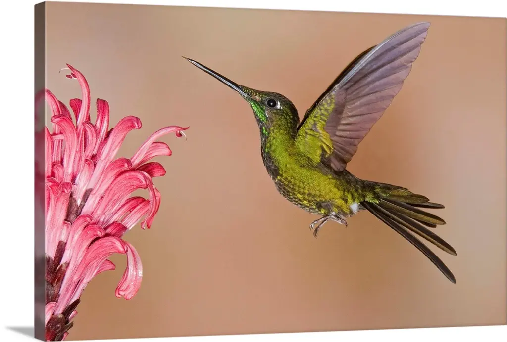 Booted Racket-tail (Ocreatus underwoodii) hummingbird male, and Western Emerald (Chlorostilbon melanorhynchus) hummingbird feeding on flower, western slope of Andes, Ecuador