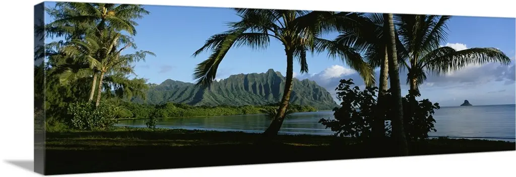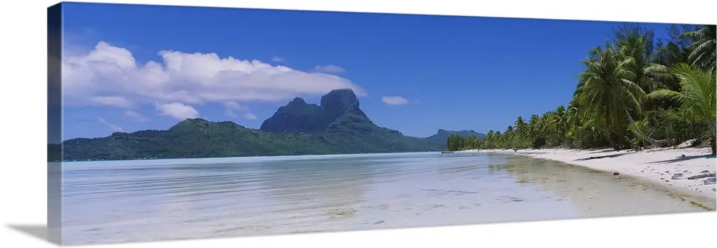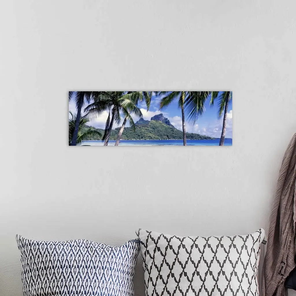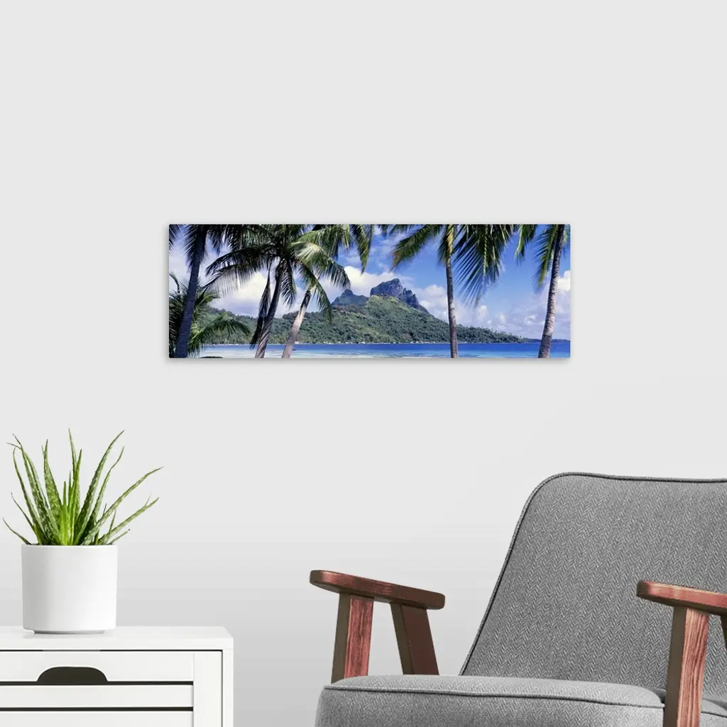 Oversized, landscape photograph of palm trees swaying over the island of Bora Bora, in the distance, past blue waters is a large mountain on Tahiti, in Polynesia.