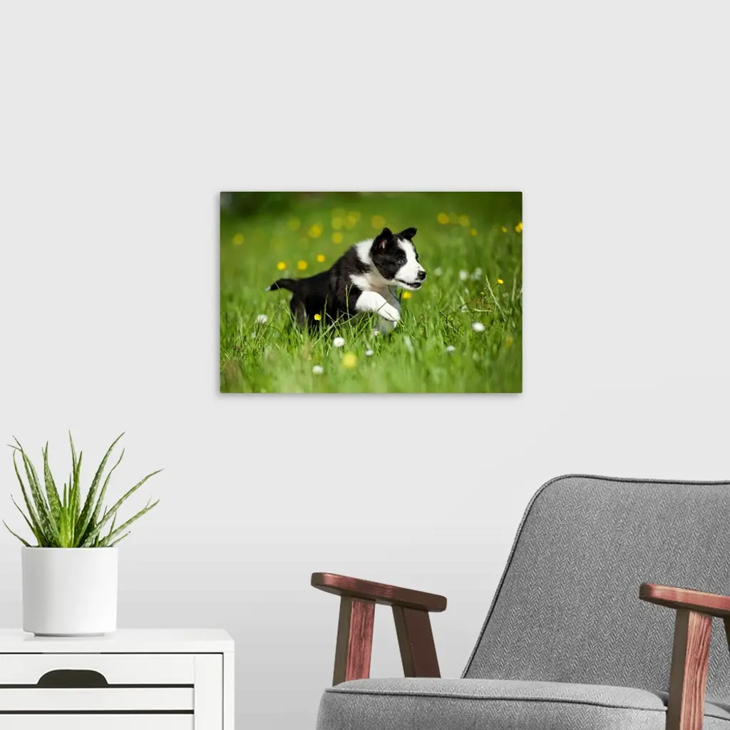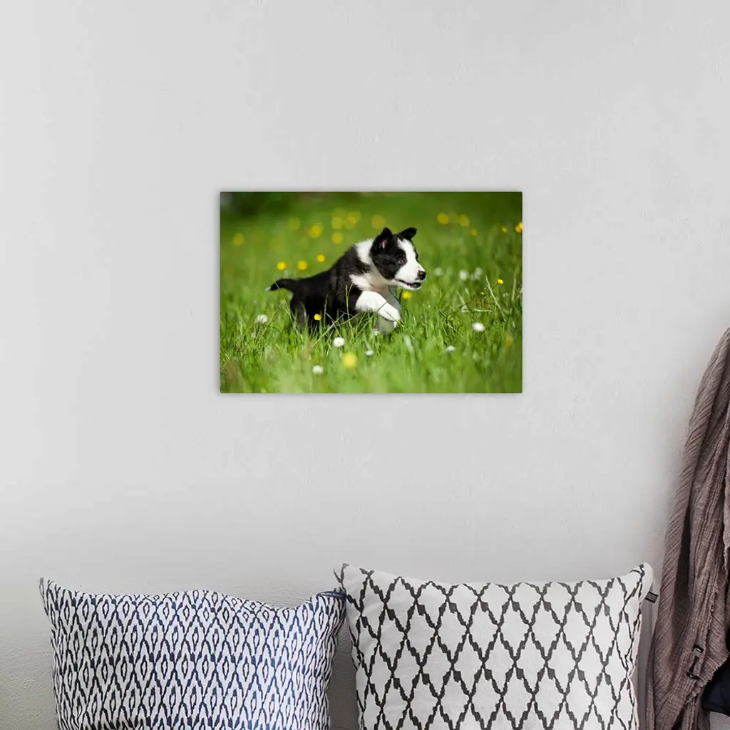 Border Collie Puppy Running In A Meadow, Cumbria, England