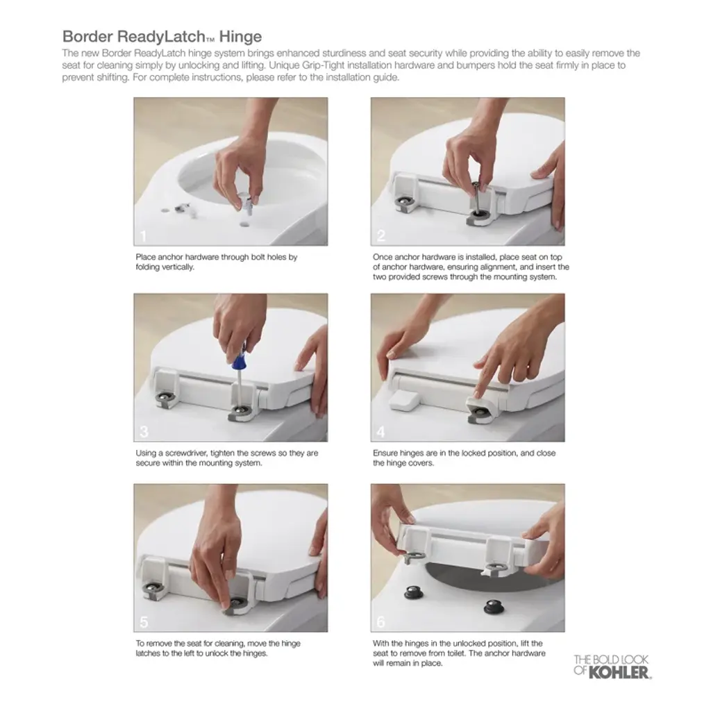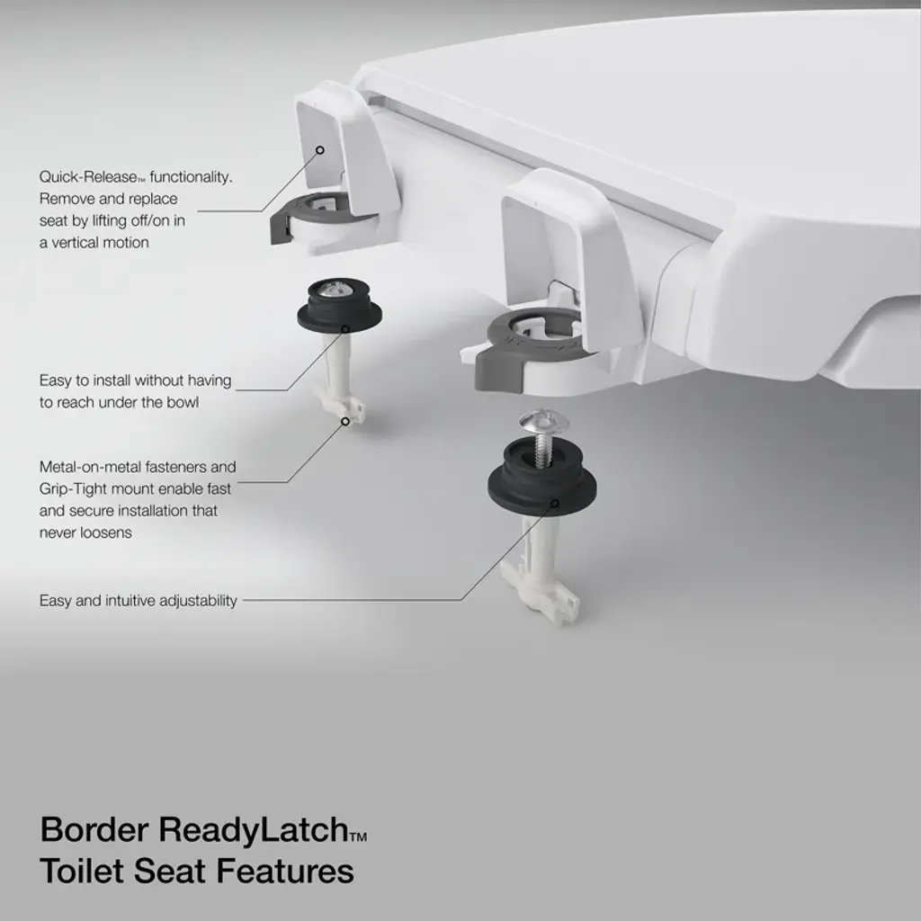 Designed to fit most toilets, the Border antimicrobial toilet seat combines subtle styling with innovative technology. The new ReadyLatch hinge system brings enhanced robustness and seat security while providing the ability to easily remove the seat for cleaning. Unique Grip-Tight installation hardware and bumpers hold the seat firmly in place to prevent shifting, and Quiet-Close prevents the seat from slamming.