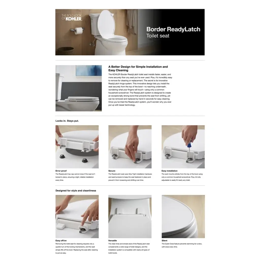 Designed to fit most toilets, the Border antimicrobial toilet seat combines subtle styling with innovative technology. The new ReadyLatch hinge system brings enhanced robustness and seat security while providing the ability to easily remove the seat for cleaning. Unique Grip-Tight installation hardware and bumpers hold the seat firmly in place to prevent shifting, and Quiet-Close prevents the seat from slamming.
