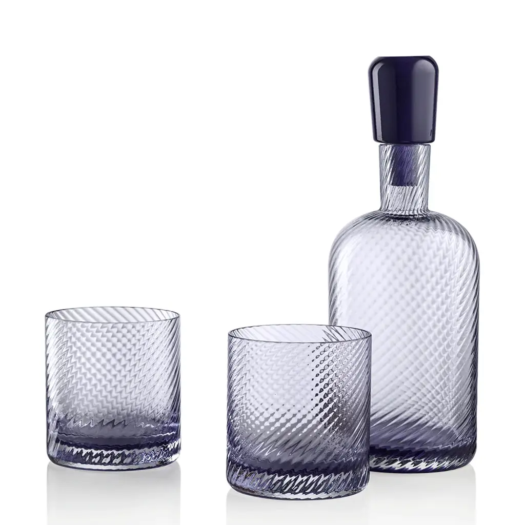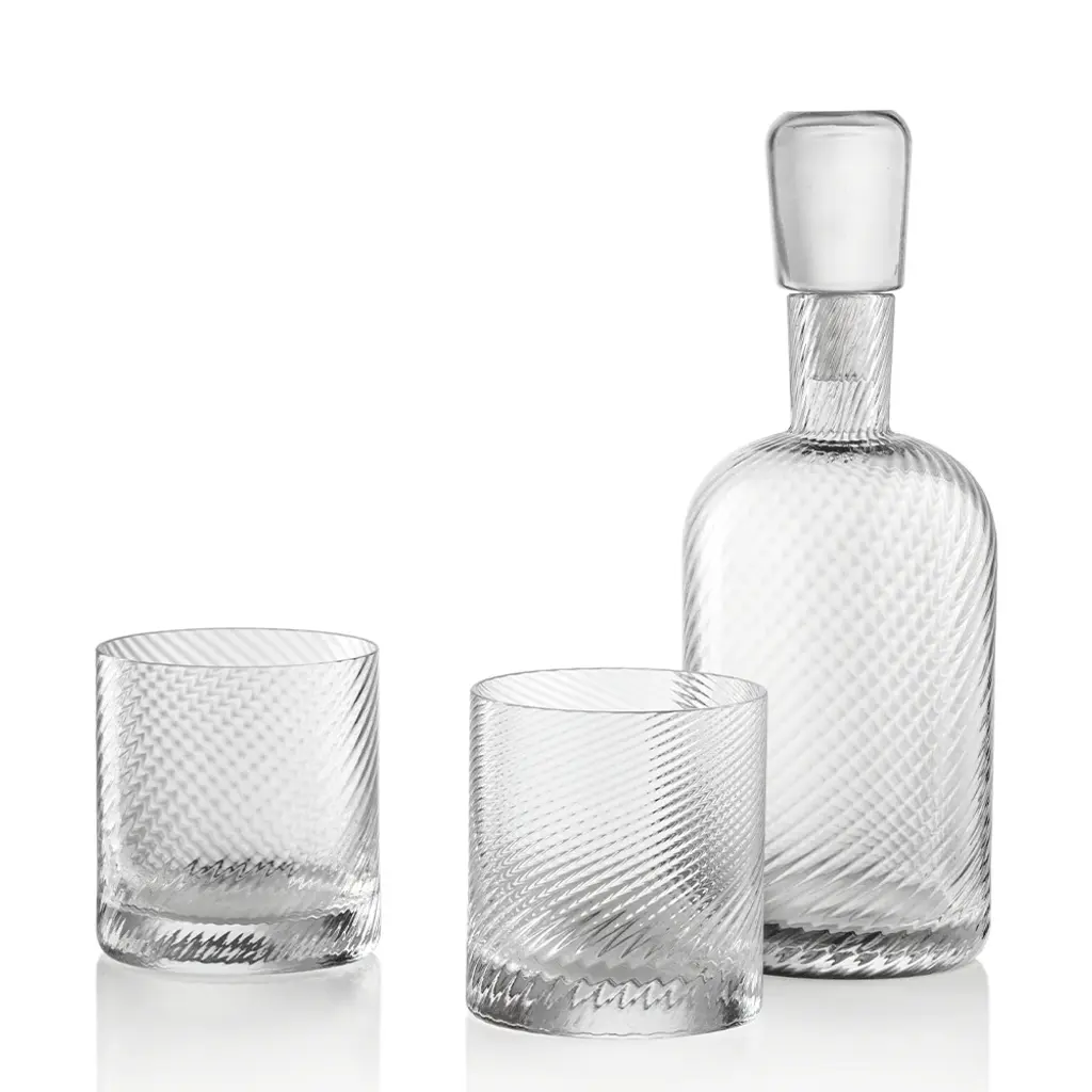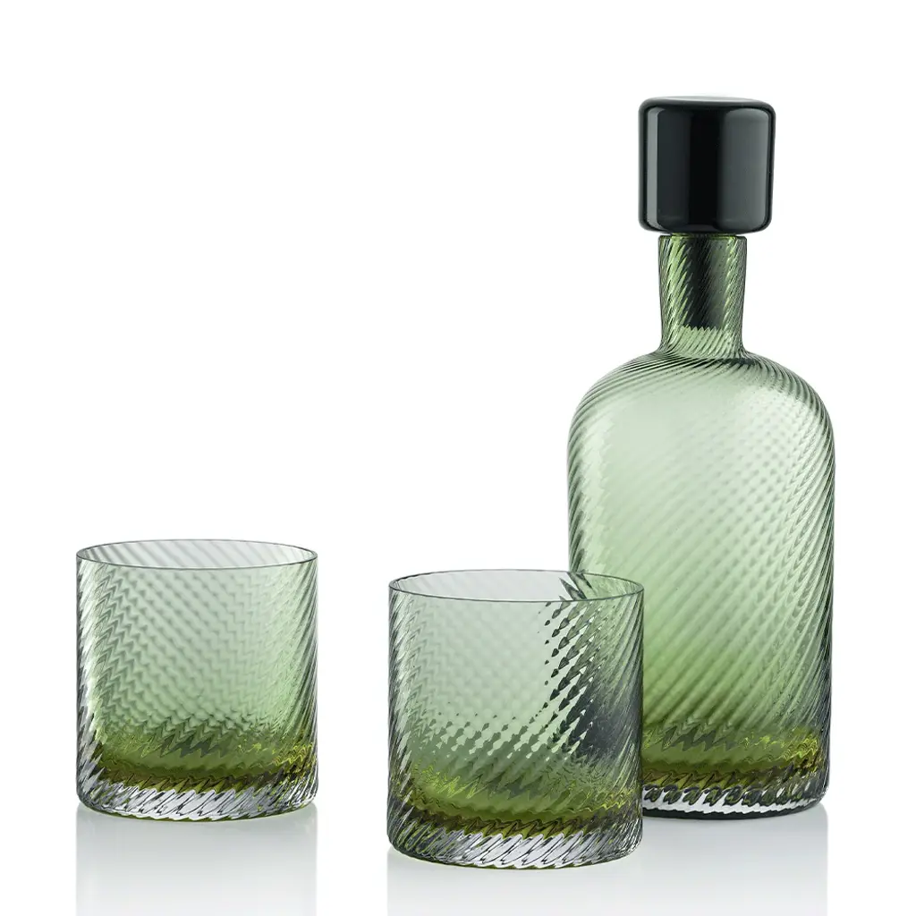 Introduce luxury to your drinking experience with the Borealis Set from Nason Moretti. Crafted with Venetian-inspired twisted pleats, or "torsé", in stunning range of hues, this set is perfect for serving your favorite whisky or as bedside water service. This exclusive Murano glass set includes tumbler glasses and a matching bottle with a solid-color lid. Highlights