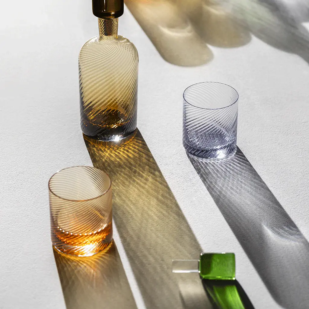Introduce luxury to your drinking experience with the Borealis Set from Nason Moretti. Crafted with Venetian-inspired twisted pleats, or "torsé", in stunning range of hues, this set is perfect for serving your favorite whisky or as bedside water service. This exclusive Murano glass set includes tumbler glasses and a matching bottle with a solid-color lid. Highlights
