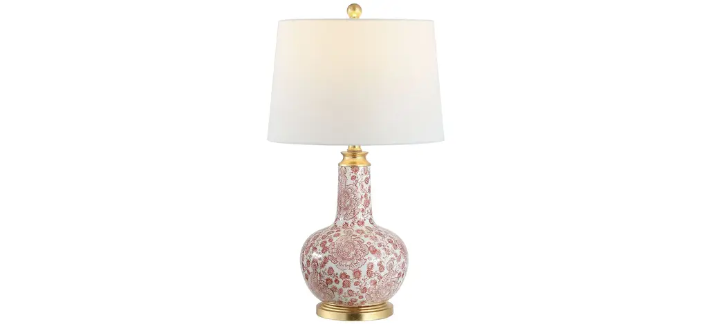 This Boris Ceramic Table Lamp provides the definition for today's classic contemporary d_cor, beautifully pairing timeless motifs with modern hues and finishes. The delicately painted red rosette pattern on its ceramic body is fabulously upgraded with its sleek gold finished base and white tapered drum shade.