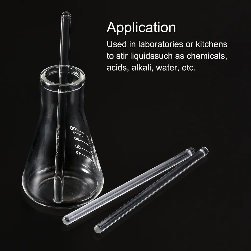 What is this?The Borosilicate Glass Sticks are widely used in laboratories or kitchens to stir liquids such as chemicals, acids, alkali, water, etc, with good acid and alkali resistance, also good resistance to high temperature.What will I get?Material: Borosilicate Glass; Color: Clear; Total Size: 200 x 5mm/7.87 x 0.2 inch(L*D); In the package of: 6 x Stir RodAre there any advantages of the product?The stick is made from borosilicate glass, good resistance to acid, alkali and high temperature, and its strength are higher than ordinary glass.Round on both ends for preventing your containers from scratches, and the smooth surface brings you a comfortable grip.How to use it?The stirring rod is reusable and washable, please wash and dry it after use for next time use. What should I notice?Please check the size carefully before ordering it!