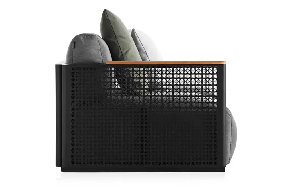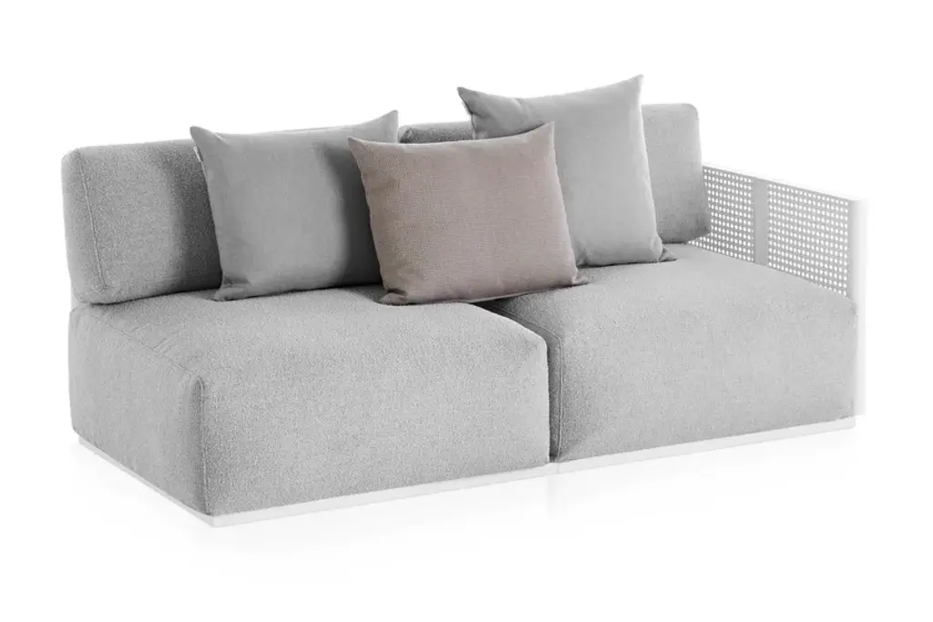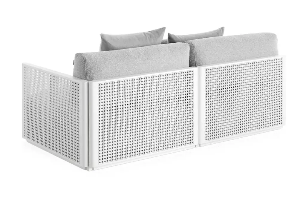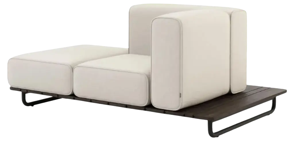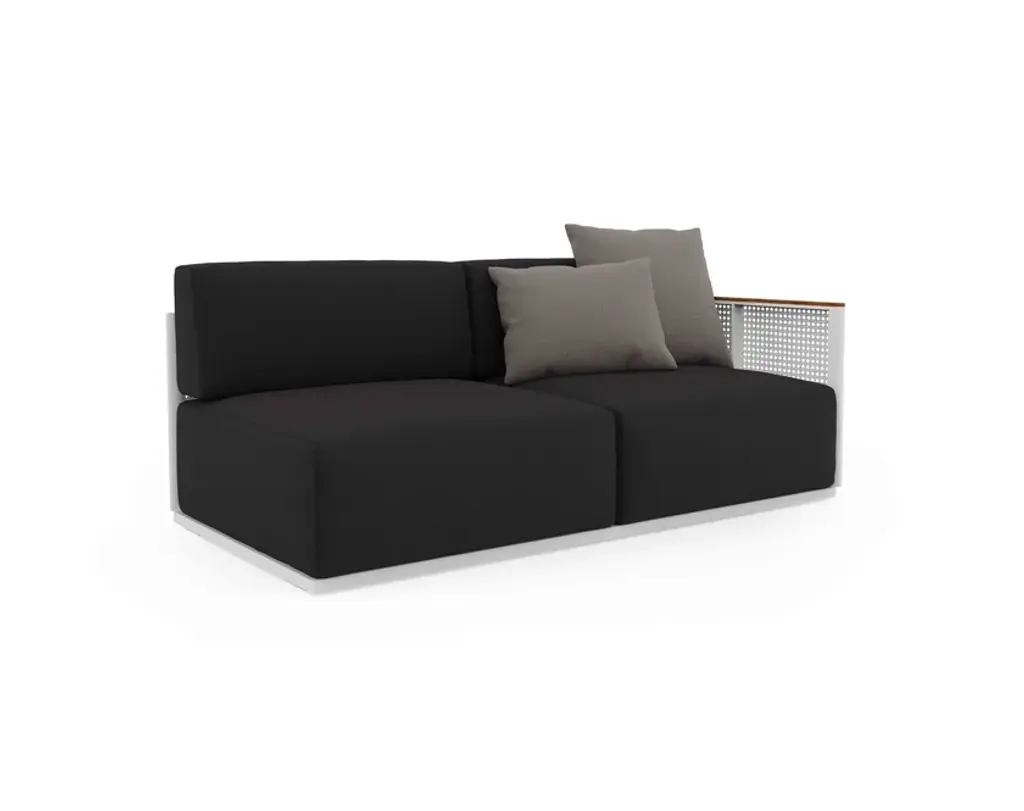 BOSC 1 is a fabric and thermo lacquered aluminium garden sofa and it is one of the seven elements that can compose the BOSC modular sofa. With iroko armrest. Available left arm or right arm.“The Mediterranean is freshness, tradition, sand and breeze. It is the flavor of things well done, from gastronomy to architecture, whether yesterday or today. Simple solutions that transmit a mixture of peace, well-being and satisfaction.Bosc is a place in Menorca that sums up the essence of the Mediterranean very well. The traditional component is always present in our imaginary. Structural weaving techniques using plant fibers such as wicker are part of our culture and we wanted to pay tribute to it through a contemporary abstraction that translates them to aluminum and integrates them into this product in a subtle but present way.”Collections colour sample: white, agate grey, bottle green, sand, bronze, wine red, blue grey, grey blue, quartz grey, anthracite and black.