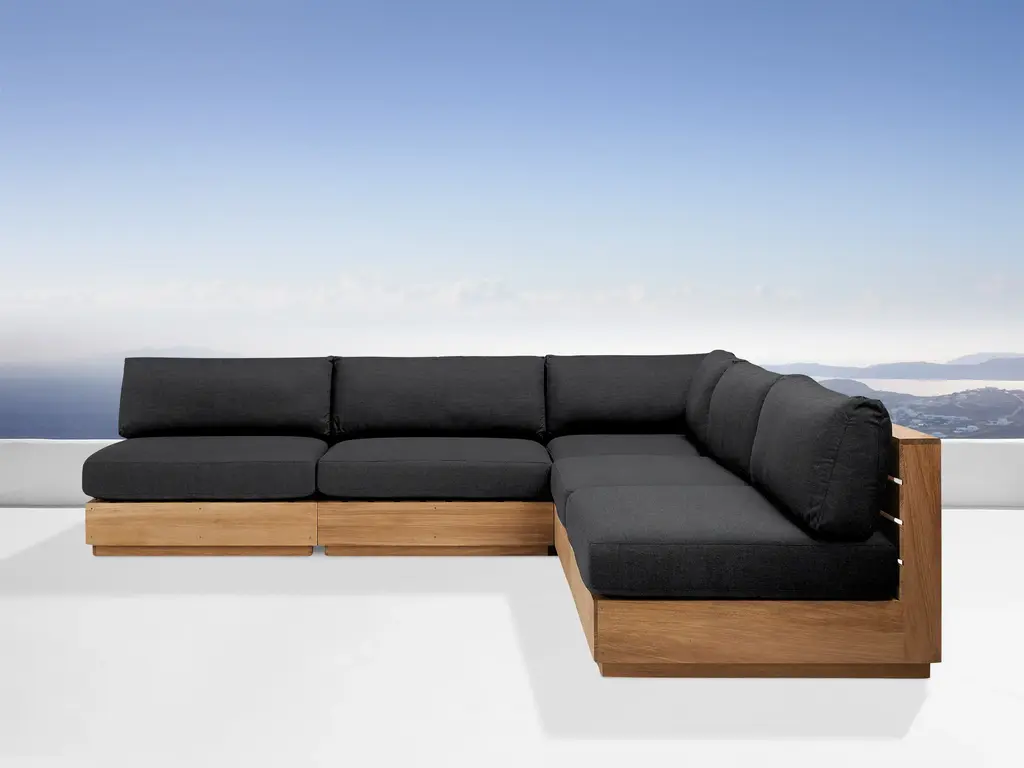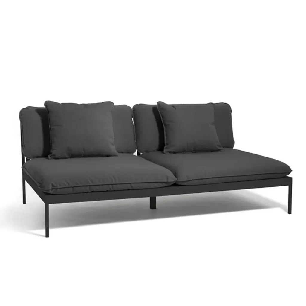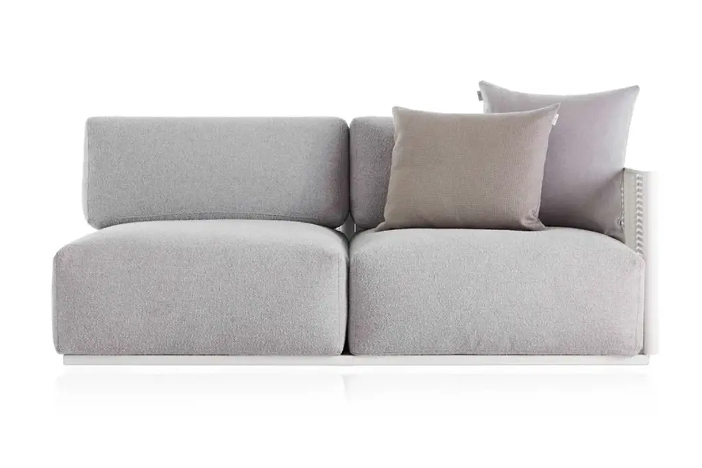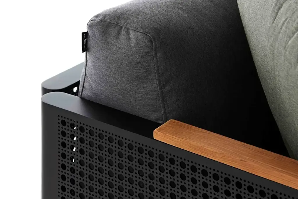 BOSC 1 is a fabric and thermo lacquered aluminium garden sofa and it is one of the seven elements that can compose the BOSC modular sofa. With iroko armrest. Available left arm or right arm.“The Mediterranean is freshness, tradition, sand and breeze. It is the flavor of things well done, from gastronomy to architecture, whether yesterday or today. Simple solutions that transmit a mixture of peace, well-being and satisfaction.Bosc is a place in Menorca that sums up the essence of the Mediterranean very well. The traditional component is always present in our imaginary. Structural weaving techniques using plant fibers such as wicker are part of our culture and we wanted to pay tribute to it through a contemporary abstraction that translates them to aluminum and integrates them into this product in a subtle but present way.”Collections colour sample: white, agate grey, bottle green, sand, bronze, wine red, blue grey, grey blue, quartz grey, anthracite and black.