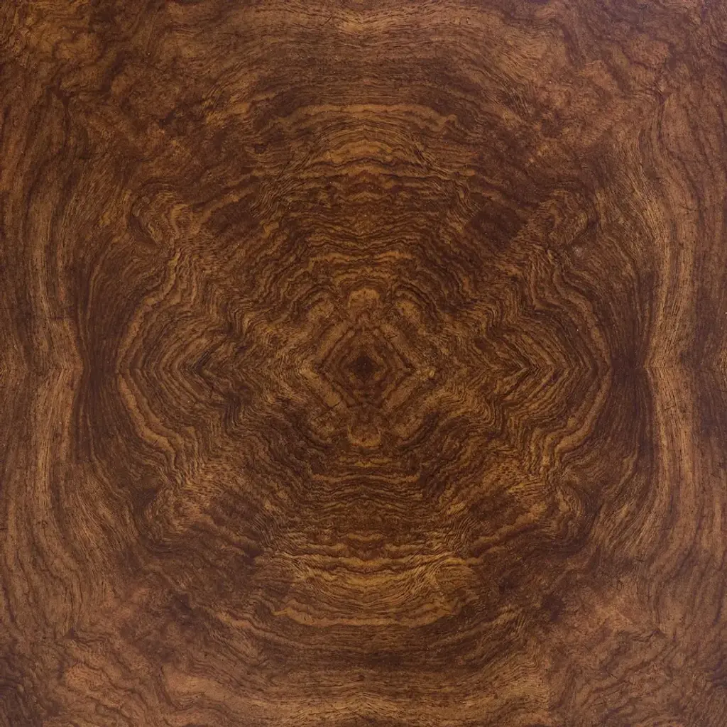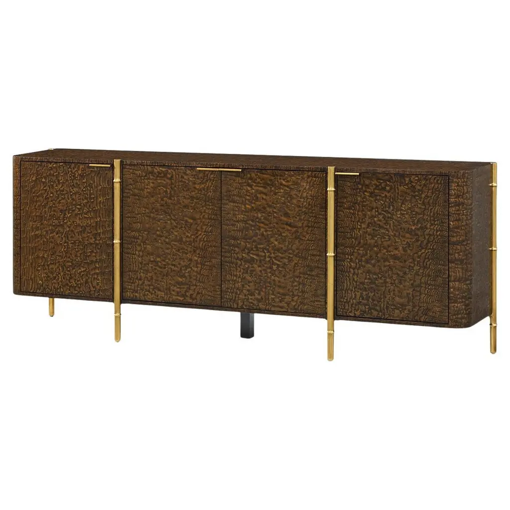 The Bosco Credenza is a refined, sophisticated piece adorned in rustic tones. Crafted from cerejeira and celtis woods in a Chatsworth finish, the piece features a gorgeous brown tone with magnificent grain patterns on display. The piece stands atop four tapered stainless steel legs in a Brushed Brass finish, providing playful contrast. This four-door credenza features three interior compartments, each with a single adjustable shelf and two central interior drawers.