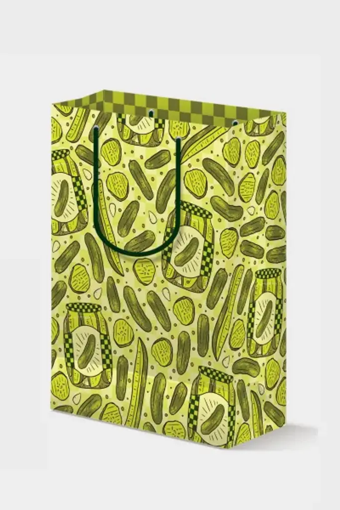 This playfully illustrated gift bag is a love letter to pickles, featuring a bold and briny pattern of jars, spears, and slices set against a punchy green checkerboard backdrop. Crafted with ultra-durable, sustainably sourced paper stock and coated in a scuff-resistant matte lamination (aka: it’s fancy and tough), this bag is ready to be used again and again—for birthdays, housewarmings, host gifts and more. Just add tissue paper and go! **Content + Care** \- Folded upper lip, metal grommets, and forest green braided rope handles \- Printed edge to edge in full color \- Gusseted sides and a reinforced flat bottom for extra support \- Designed in Brooklyn and made in the USA **Size** \- Size: 9.6" W x 13" H x 4.5" D (comfortably fits three wine bottles, plus room for snacks!)