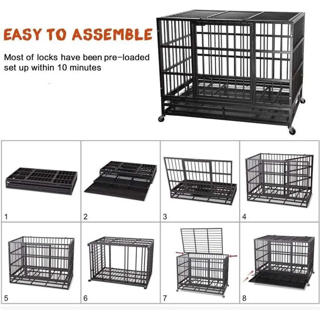Our dog crates will provide your furry family member comfort and security. Featuring with double access doors, it offers maximum convenience and is extremely safe for containing your pets. Easy to setup, store, transport and clean! Great for securely keeping your pets contained. We esteem every pet owner to be worthy of own! Our factory is dedicated to building heavy duty crate for large dogs. In addition to robustness, we also consider the comfort and safety of the dog and the convenience of the owner. If there is a quality problem within a year, we are willing to solve for you, please feel free to buy Bossin dog cage for your dog. Dual-door design provides your dog with an easy way to access in and out let you interacting with your dog.Equipped with four casters for easy moving. Two of them are lockable which increase stability. The movable tray makes it easier to clean your dog cage Indoor/ Outdoor/ Yard