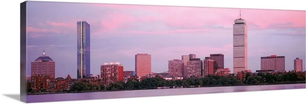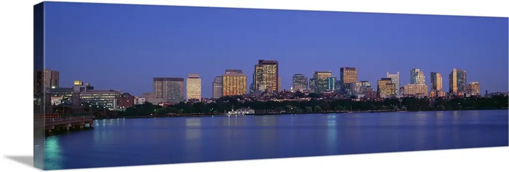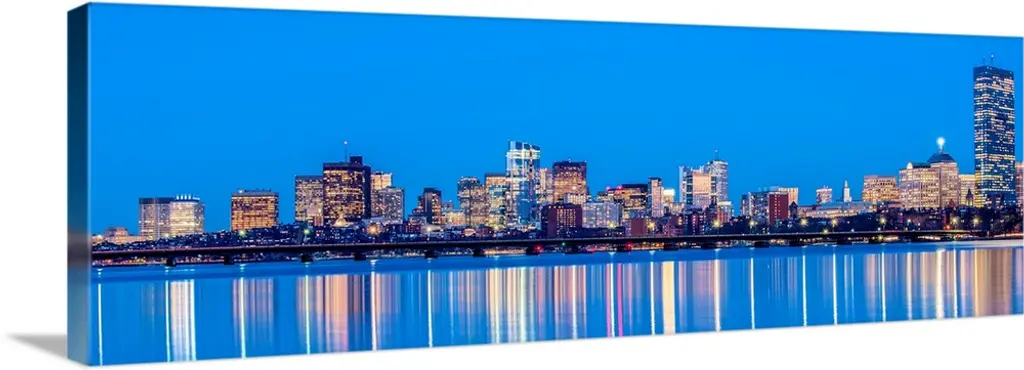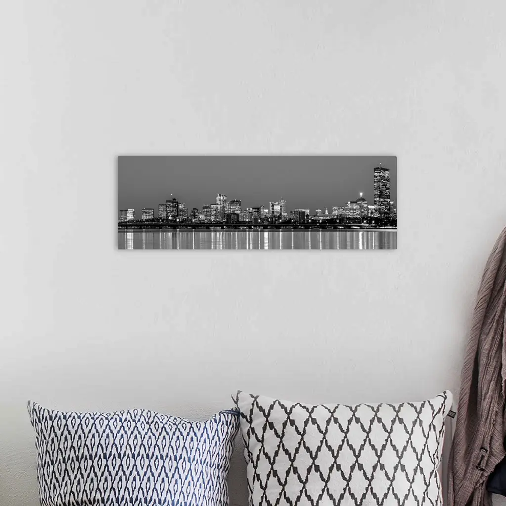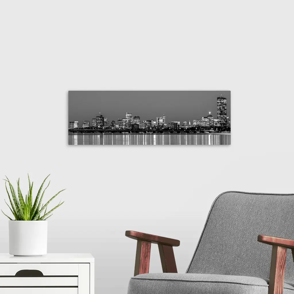 Panoramic view of the Boston City skyline at night, with lights reflected in the water.
