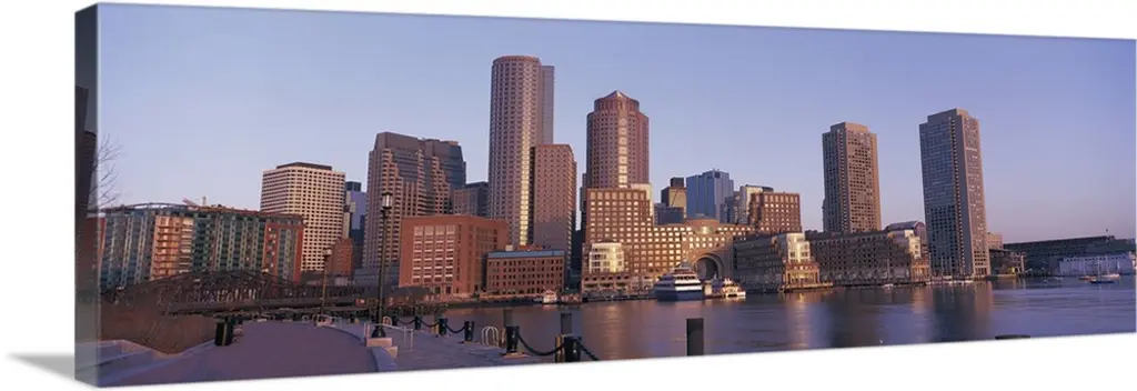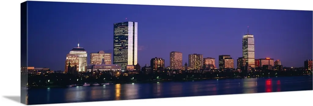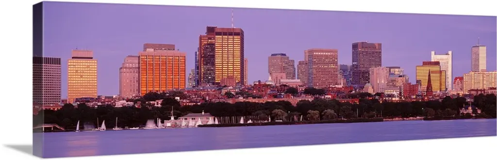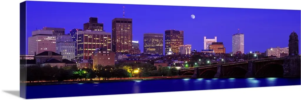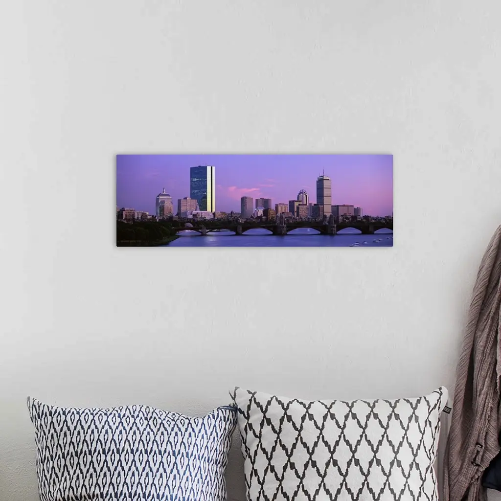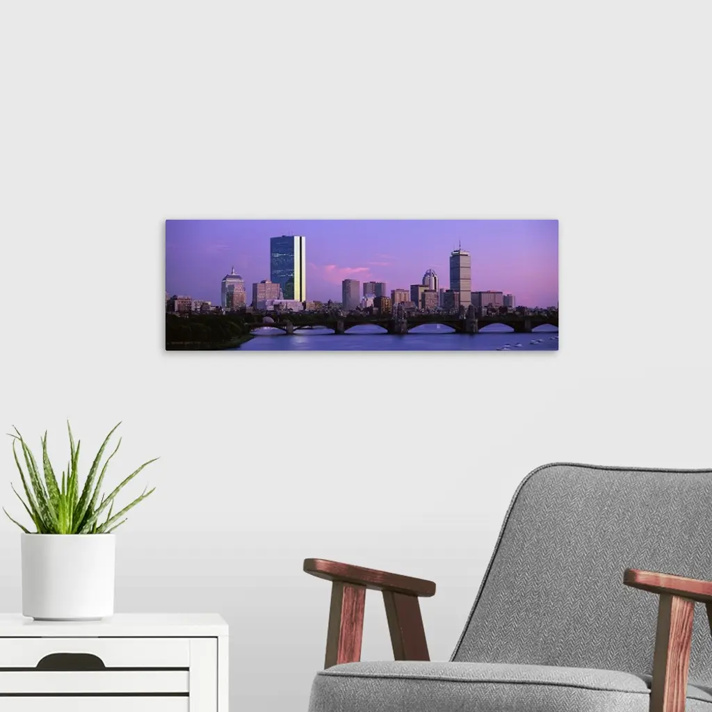 Panoramic photograph shows Longfellow Bridge spanning the Charles River in the Northeastern United States. The background of this picture includes a skyline littered with various skyscrapers of differing heights.