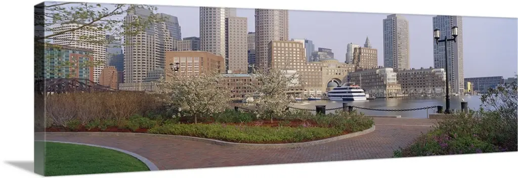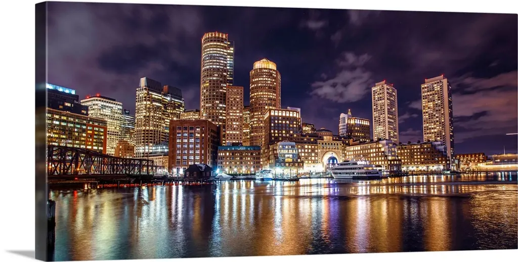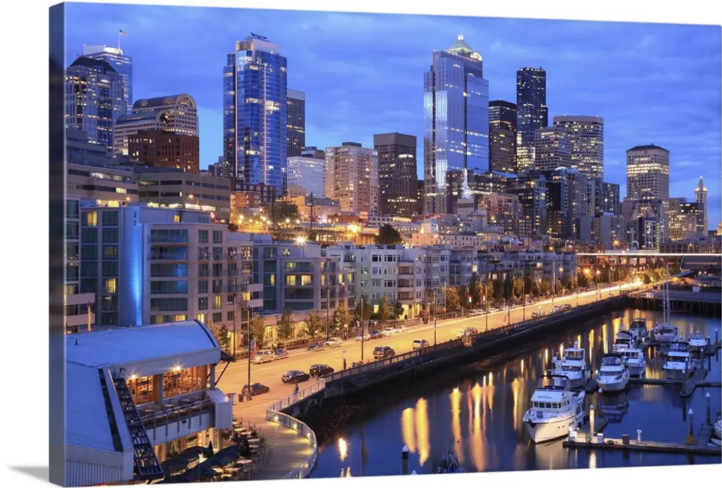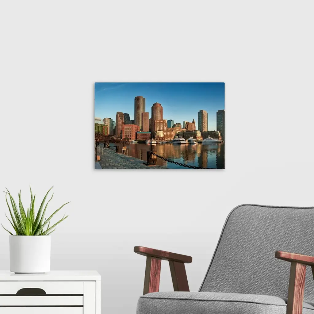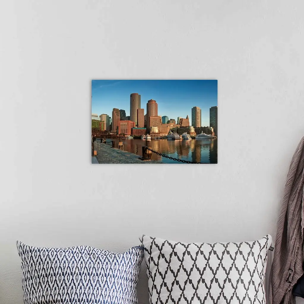 This wall art is a horizontal photograph taken from a harbor dock that shows several skyscrapers and big yachts floating on the water.