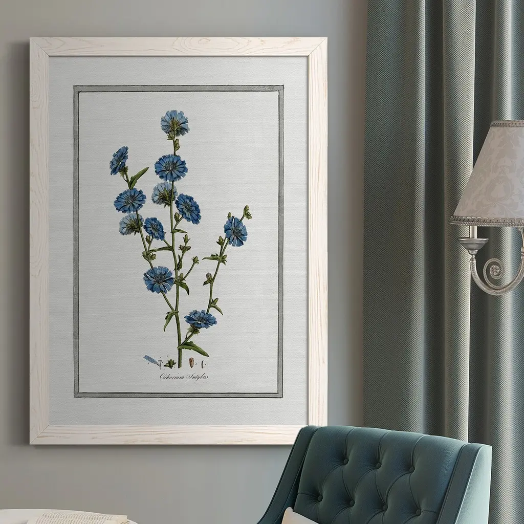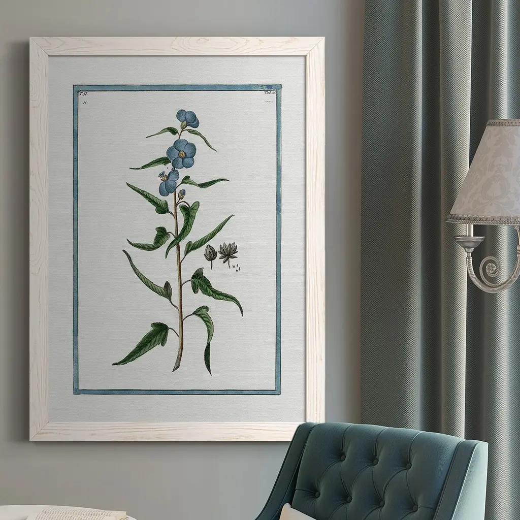 This botanical print has been deckled around the edges and mounted on a white mat board. It is framed under glass in a wood toned moulding.