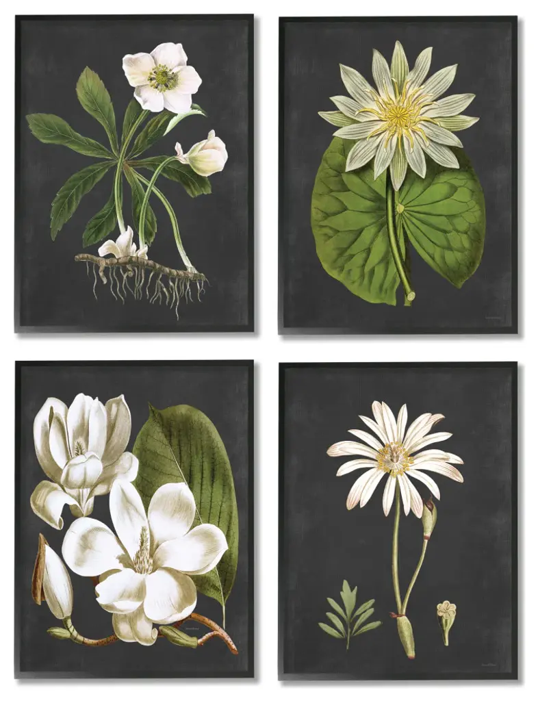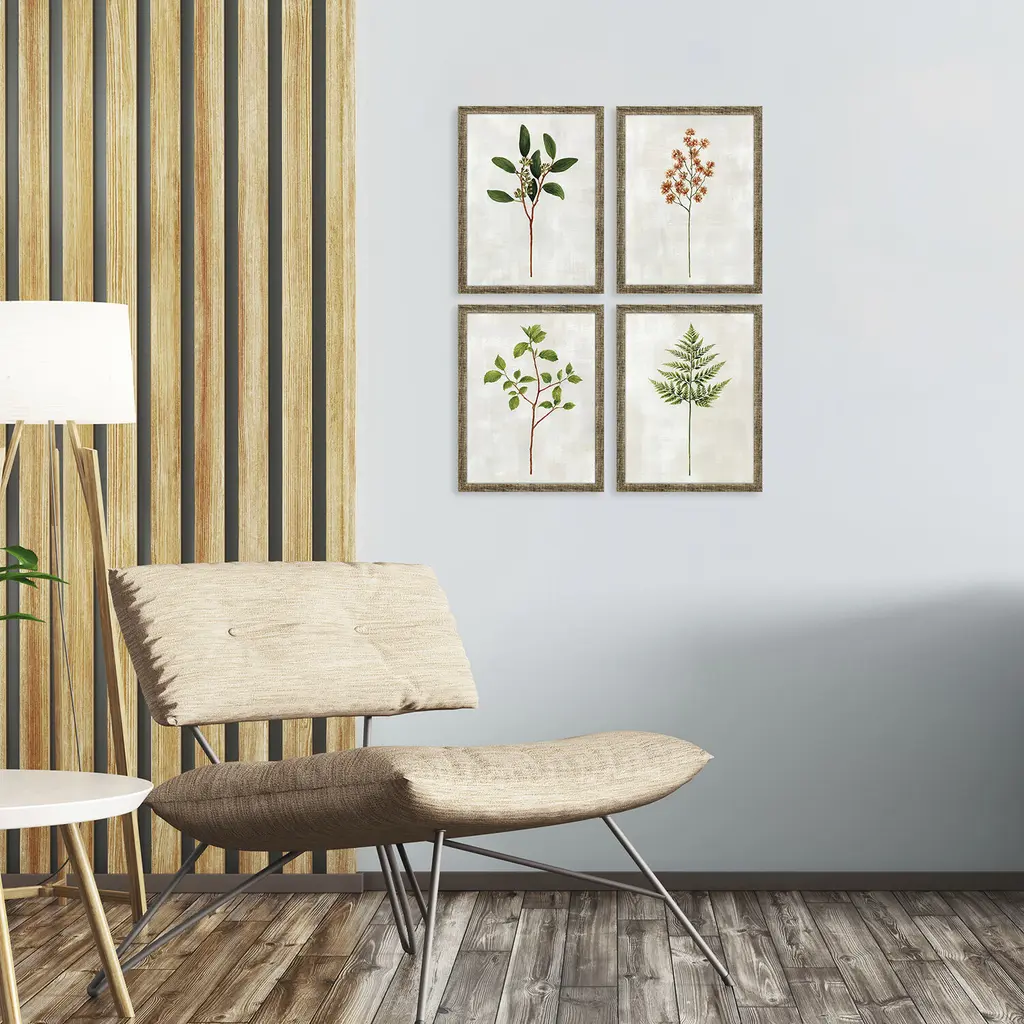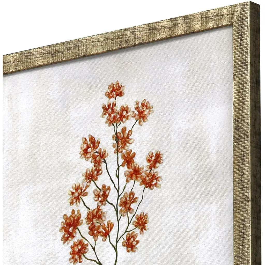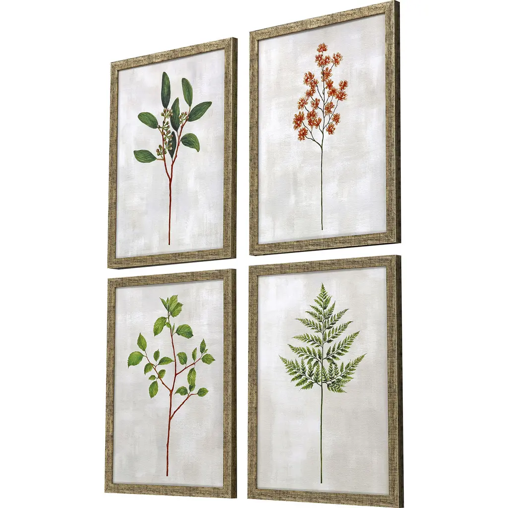 Traditional botanical series is framed in a ribbed moulding in distressed antique gold.