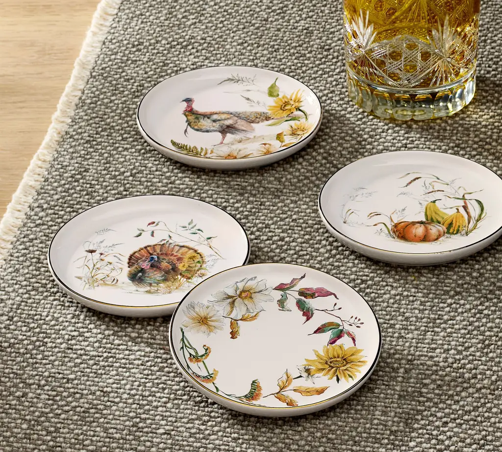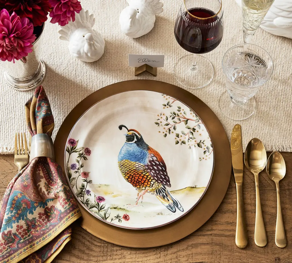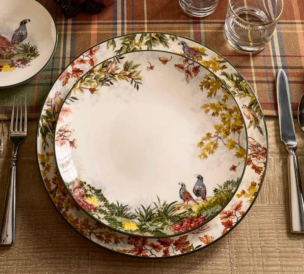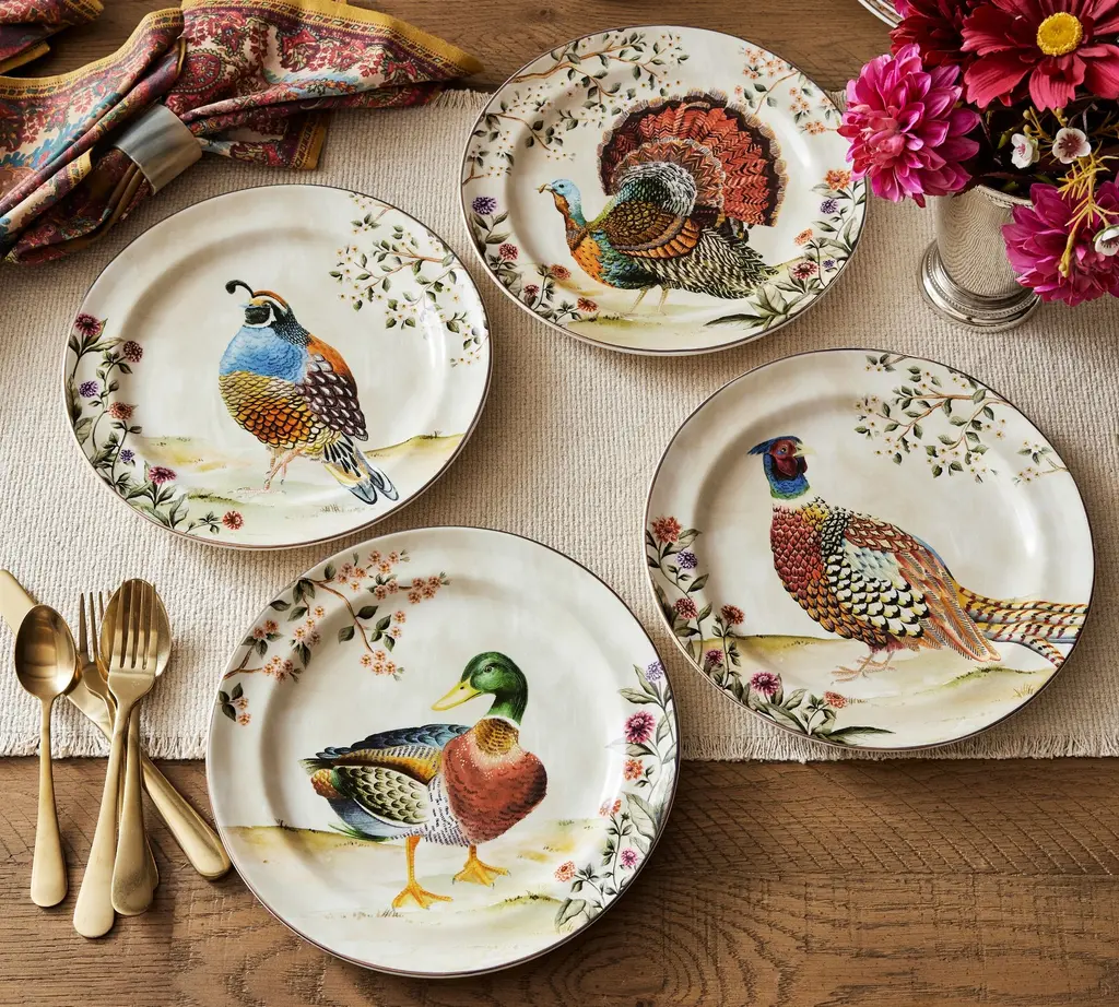 This autumnal stoneware is as beautiful as the fowl that inspired them. The original design is painted in our own studio, where a vivid blend of colors come together in realistic detail. A gold rim finishes the look for an elevated feel. Even better, it’s dishwasher safe and designed to last. Complete your seasonal table with the set.