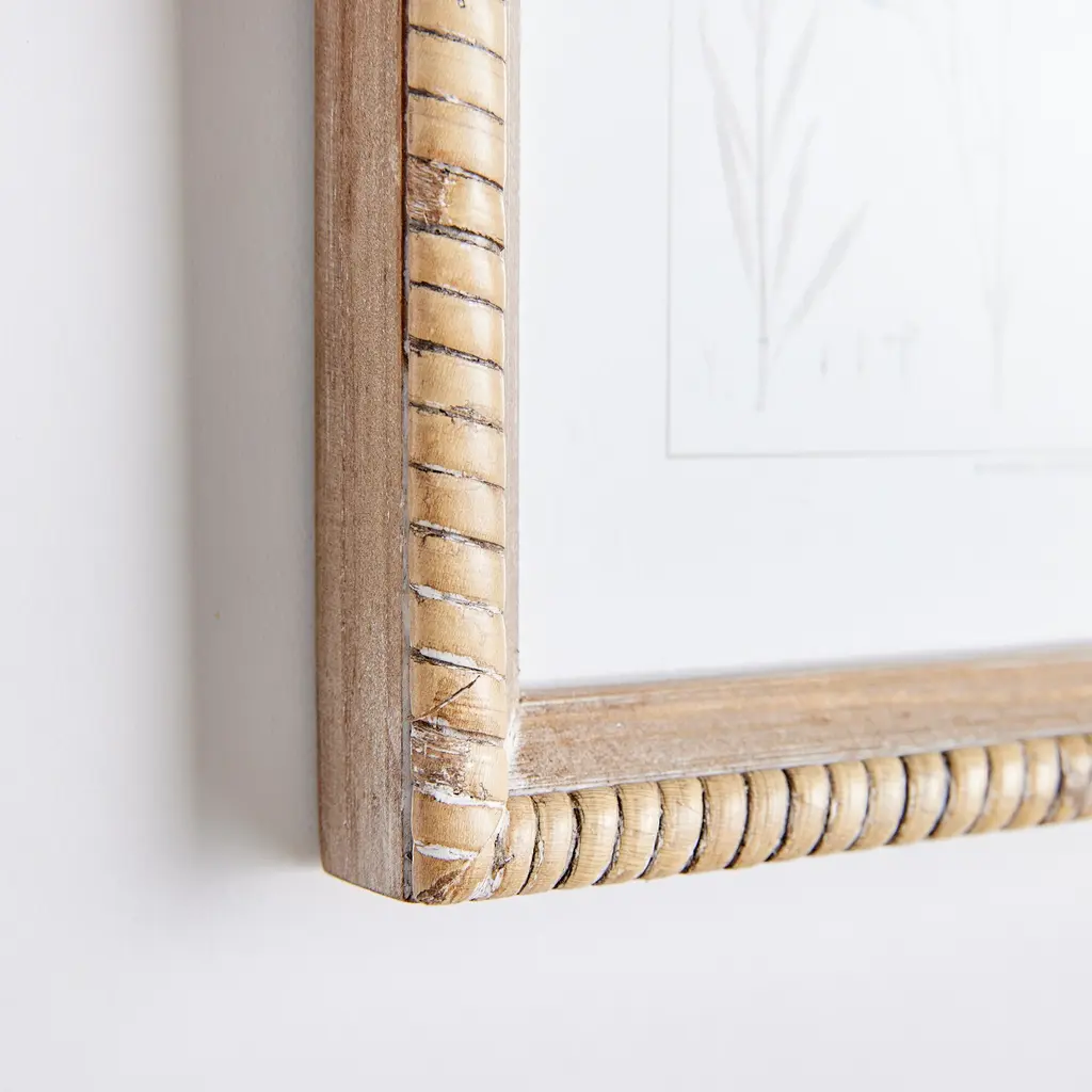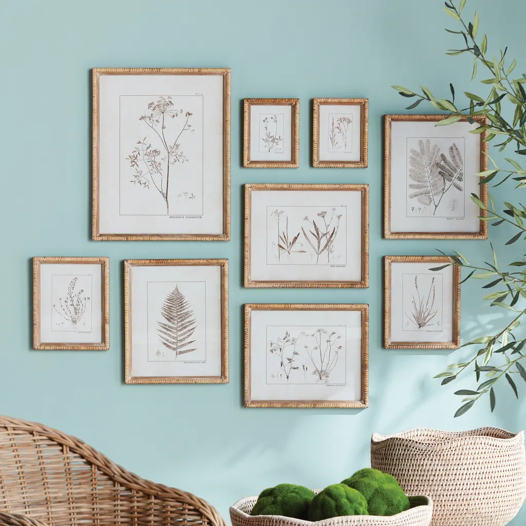 These traditional sepia botanical prints are complemented with rattan wood frames. This handsome set of nine was carefully curated to create a stunning salon style arrangement, but can also be split up into sets for smaller spaces. A traditional choice for home office or study. Ready to hang. Coordinating gallery set with Varying sizes included: 15.75 x 1 x 19.75; 11.75 x 1 x 14; 8.5 x 1 x 10.5; 6.25 x 1 x 7.75. Rattan wrapped frames.