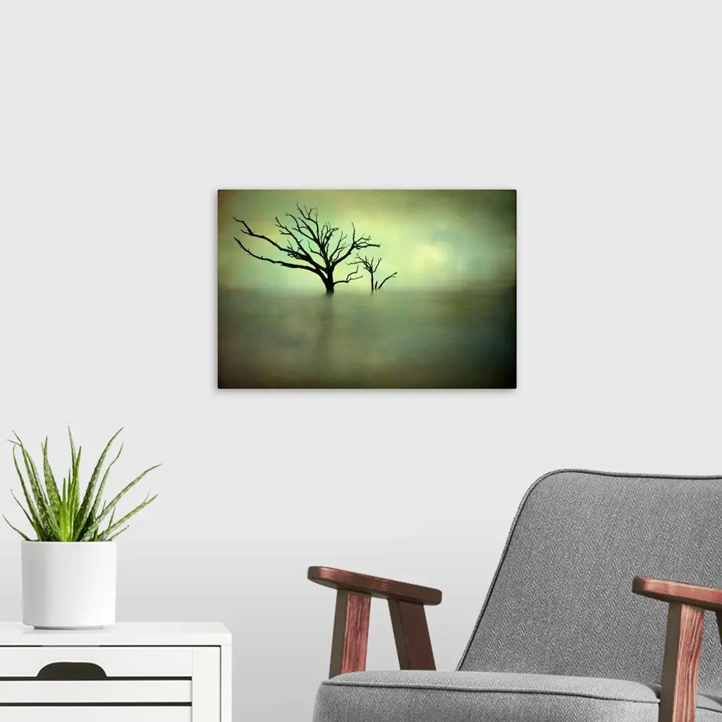 Silhouettes of two trees in the ocean off the South Carolina coast in green light.