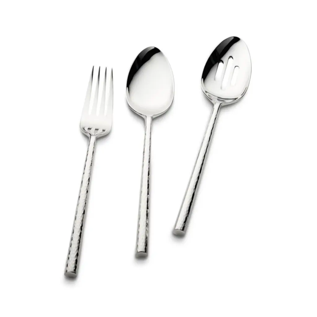 A blending of generations brings a contemporary new shape to the classic hammered finish. Stainless steel servers with stylish heads and round hammered handles is polished to a mirror finish.