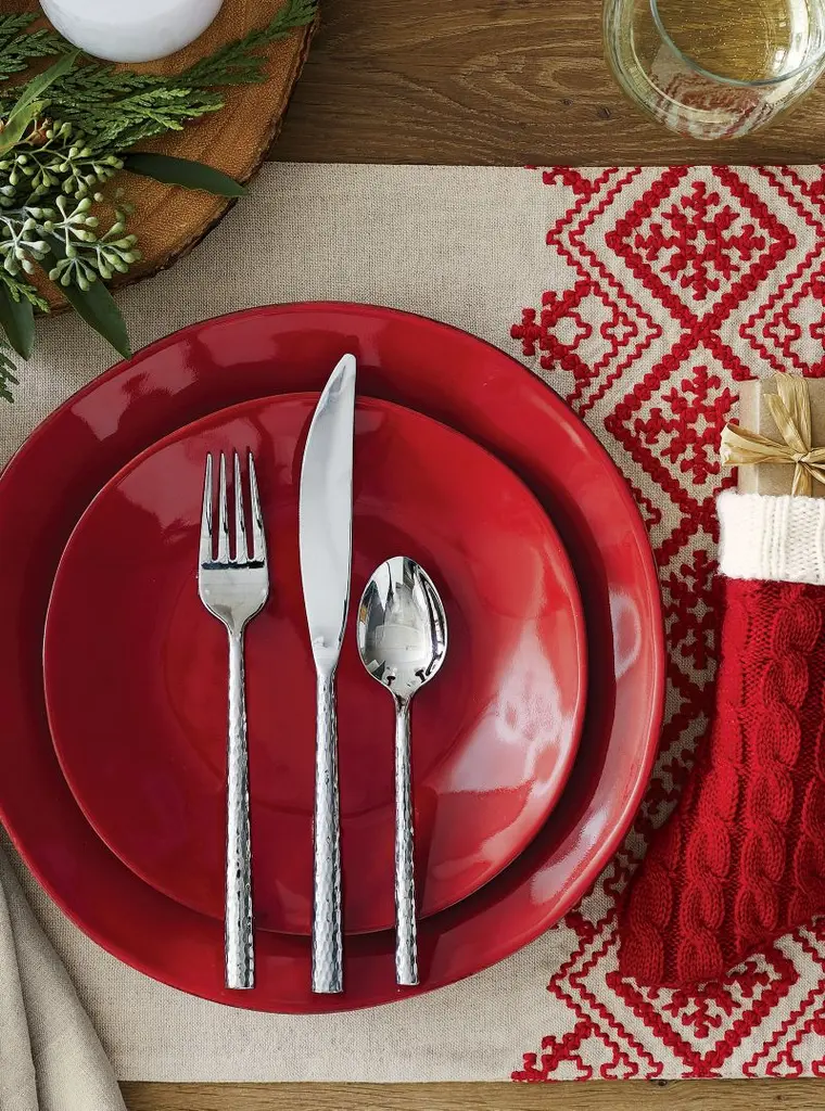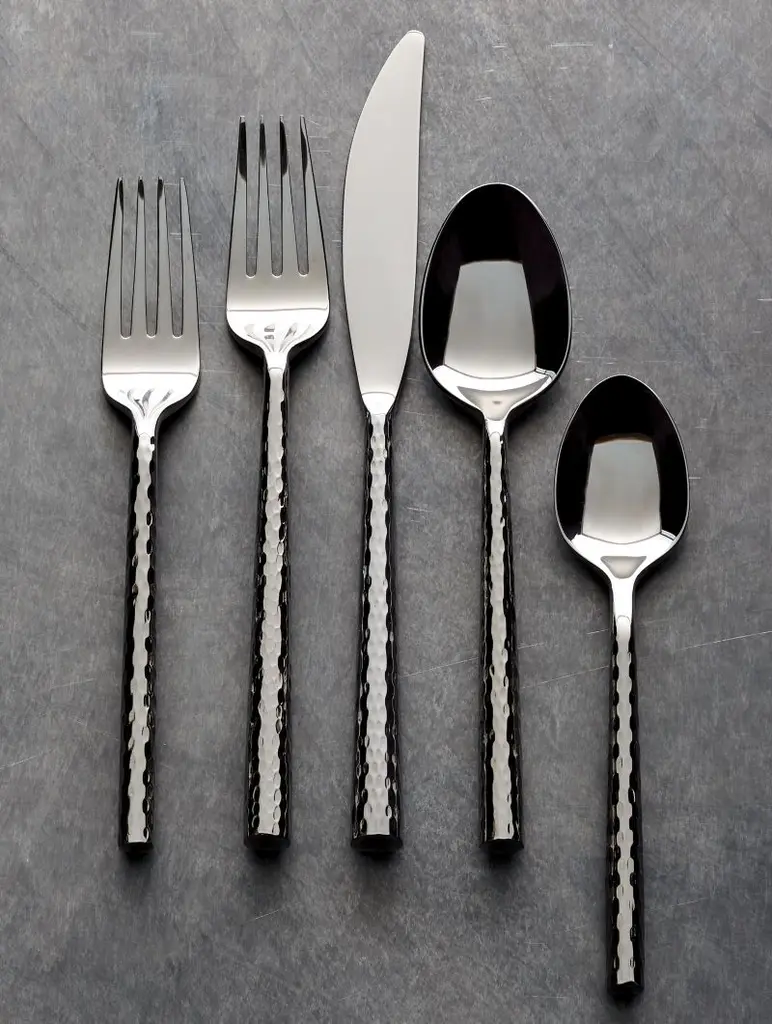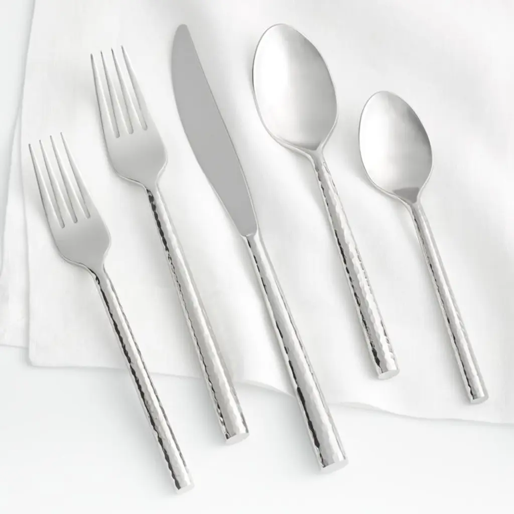 A blending of generations brings a contemporary new shape to the classic hammered finish. Stainless steel flatware with stylish heads and round hammered handles is polished to a mirror finish.