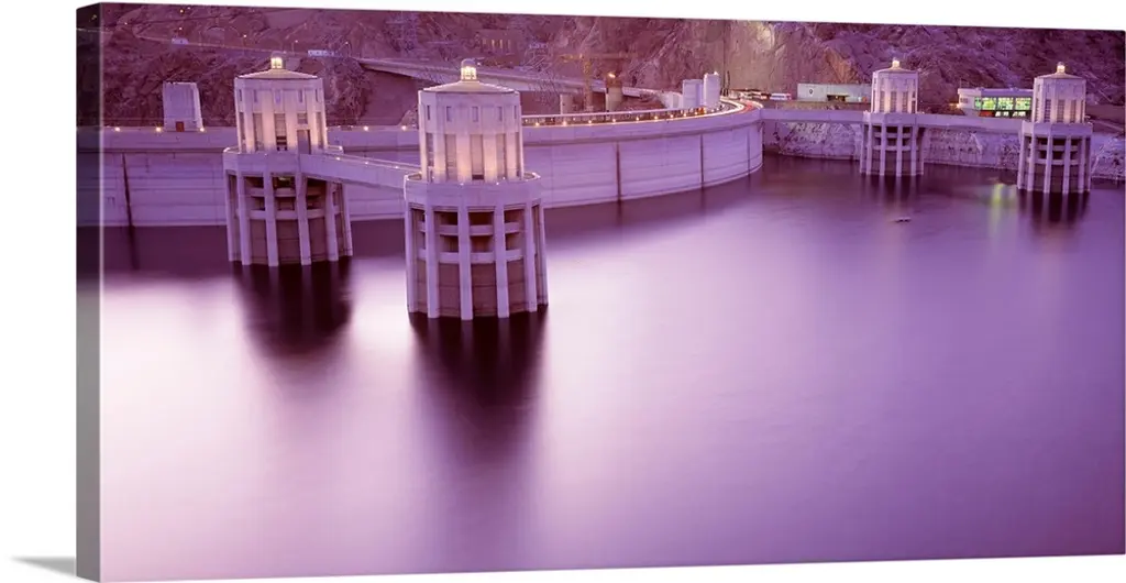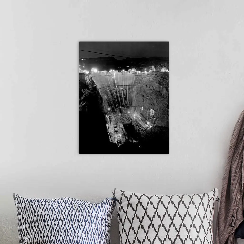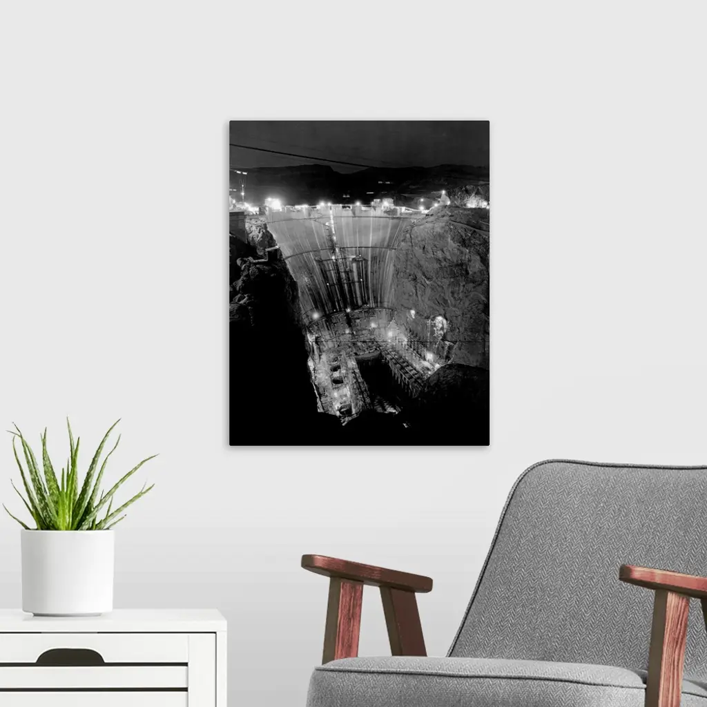 Floodlights illuminate Boulder Dam at night during construction. Boulder Dam, now called Hoover Dam is one of the world's largest dams, holding back the waters of the Colorado River between Arizona and Nevada to create power and Lake Mead. Nevada, USA.