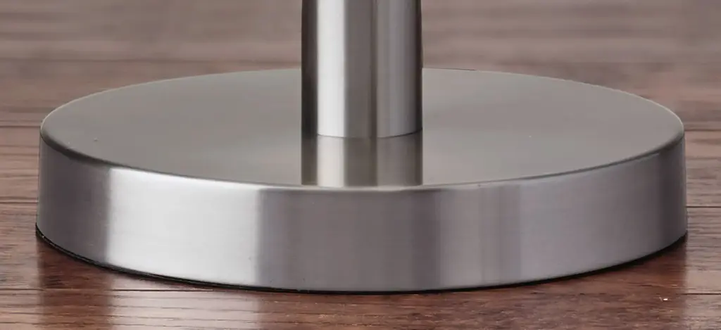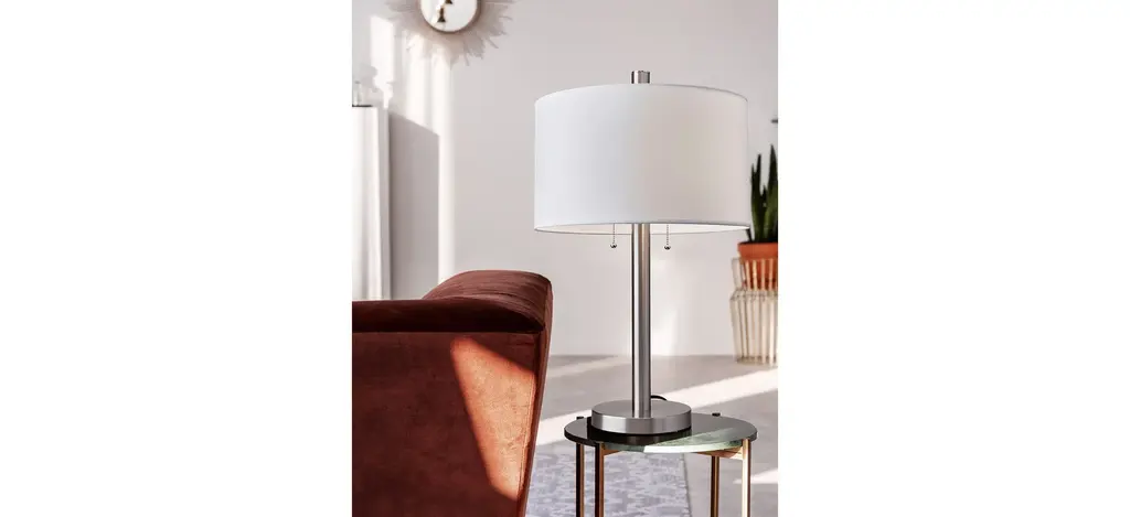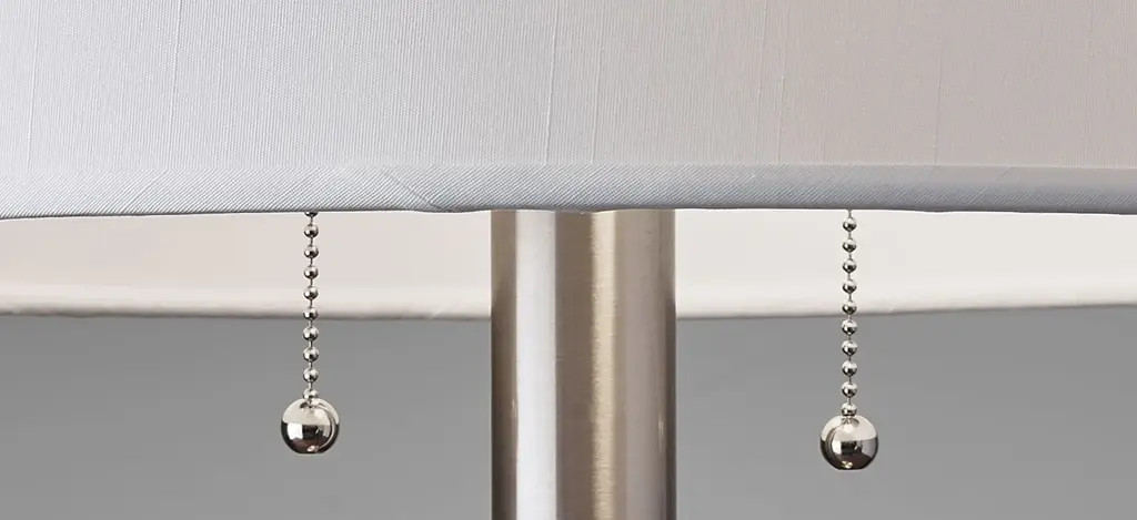 The Boulevard table lamp easily illuminates a living room, den or bedroom while projecting stylish sophistication. The chunky pole body and matching finial create a floating effect for the silk-like fabric drum shade. Double sockets operated by pull-chains can be fitted with 100 Watt incandescent or equivalent bulbs. Two pull chain switches, each with on/off functionality allow for a dim or bright light setting. This lamp has a cord and is smart outlet compatible. Bulbs are not included.