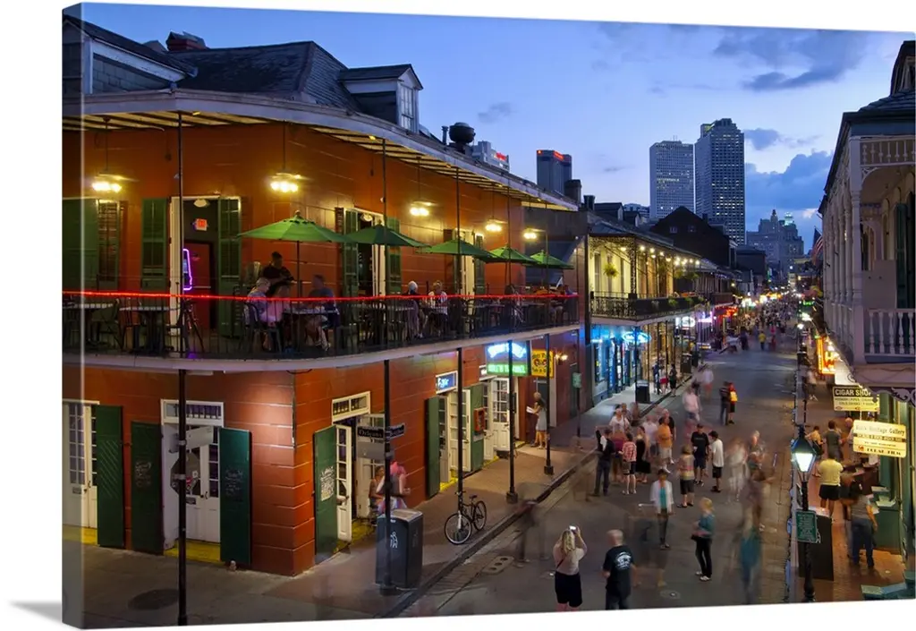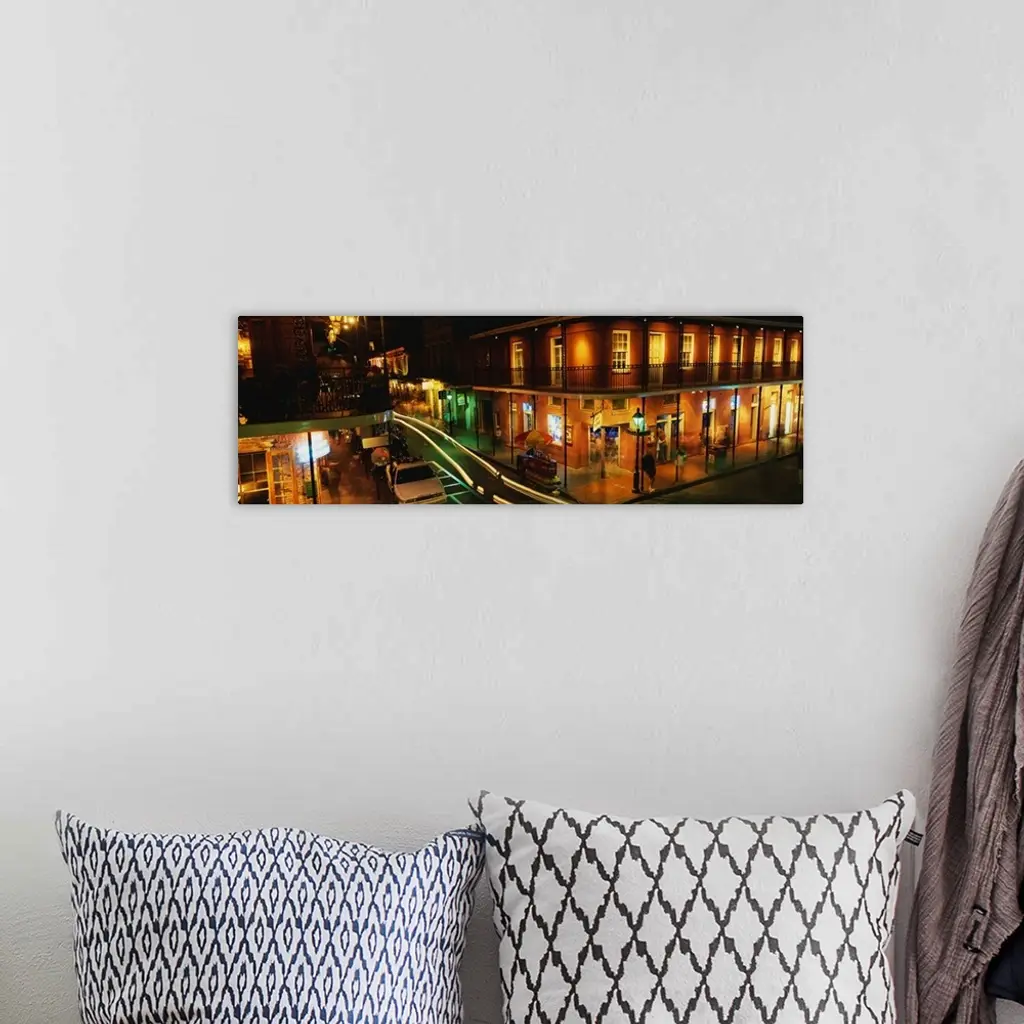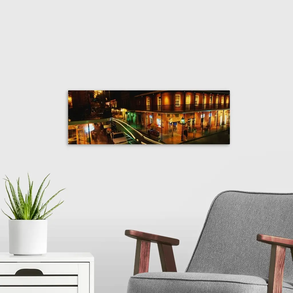 Panoramic photograph displays a nighttime view of the busy streets within the French Quarter located in a famous Southeastern United States city. Photographer uses a slow shutter speed to get the effect of fast moving lights in the picture.