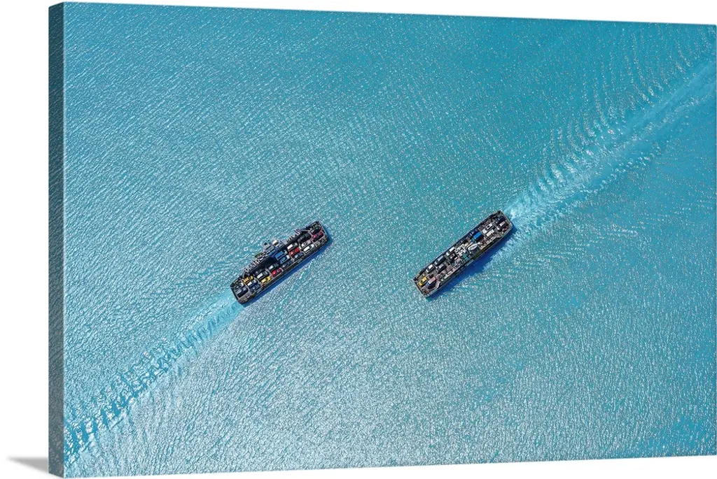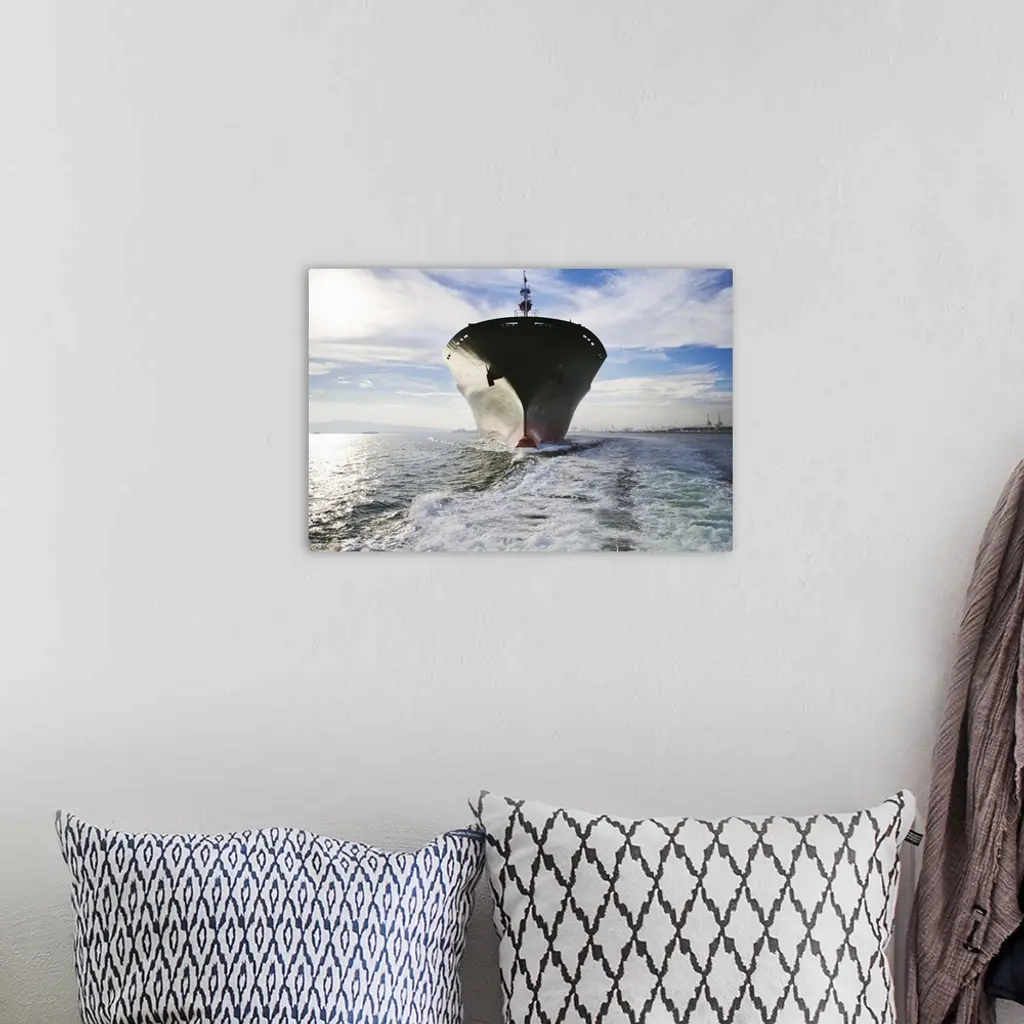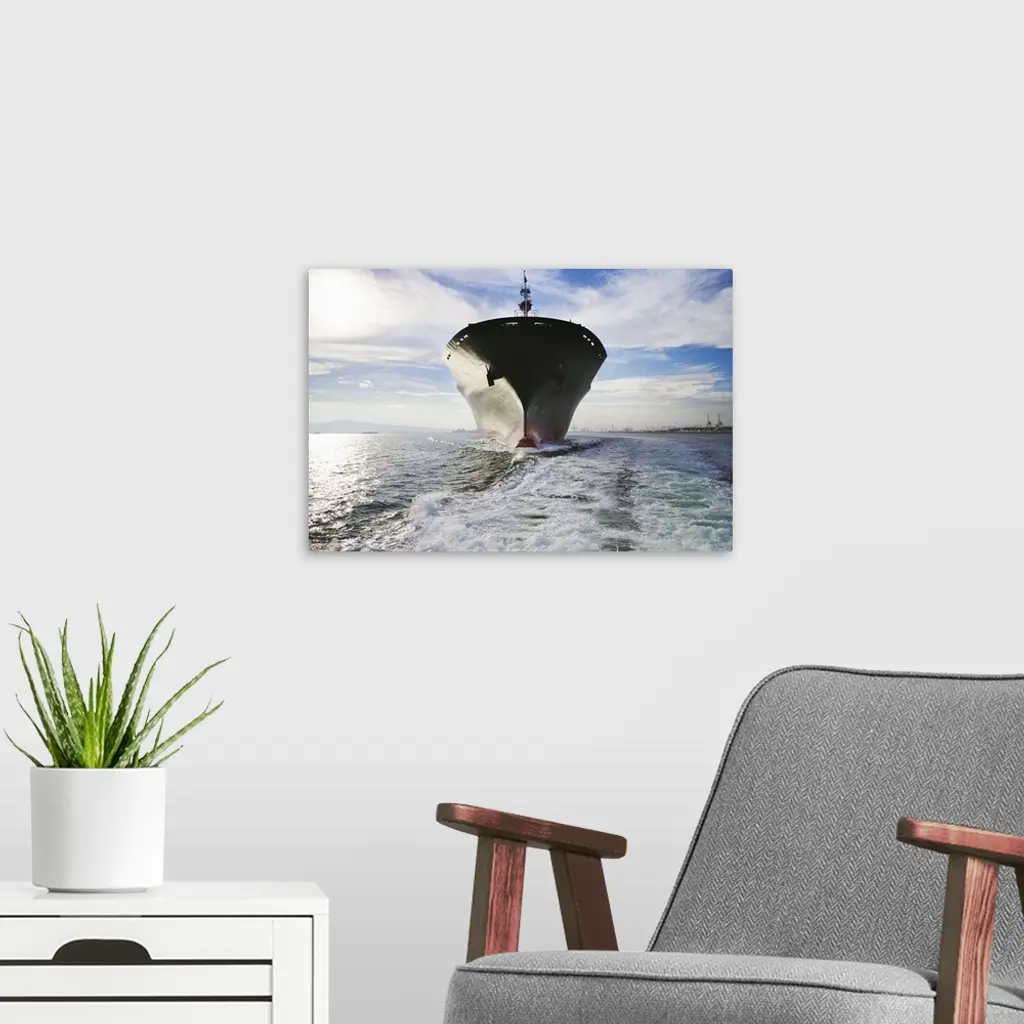 Bow View Of Cargo Ship Sailing Out Of Port.