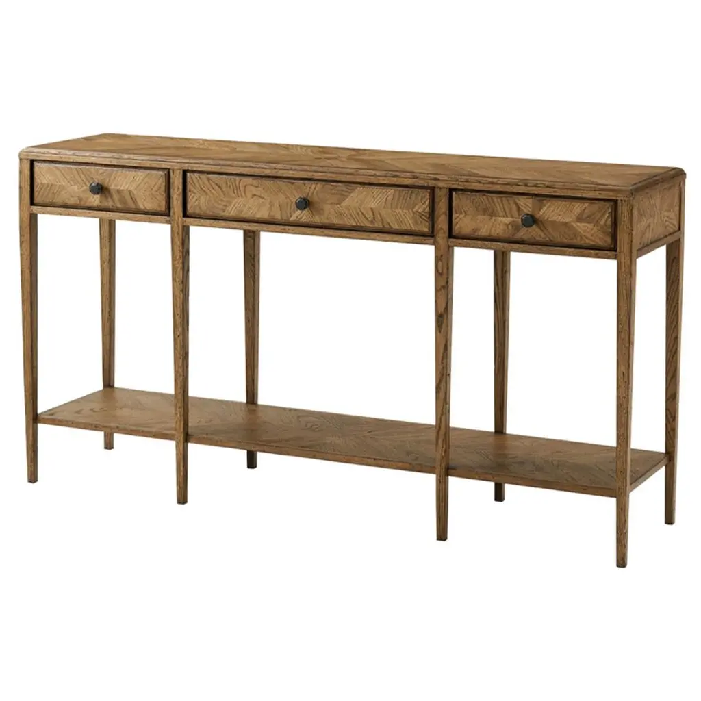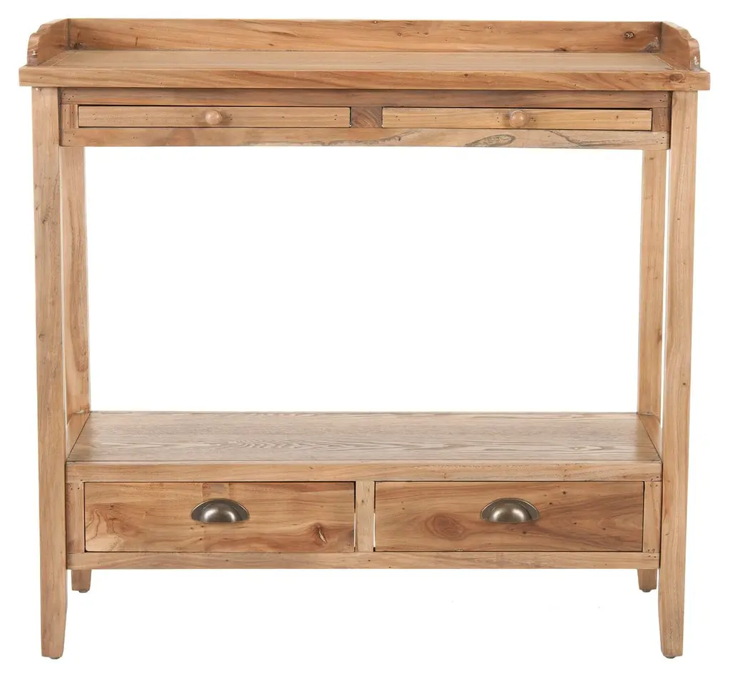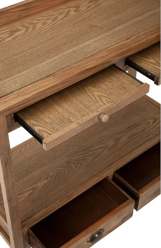 Made from sturdy elm, this console sports a pickled oak finish. Its flat back allows it to be placed flush against the wall. In addition to two drawers, it has two pullout shelves--perfect for getting organized in the morning.