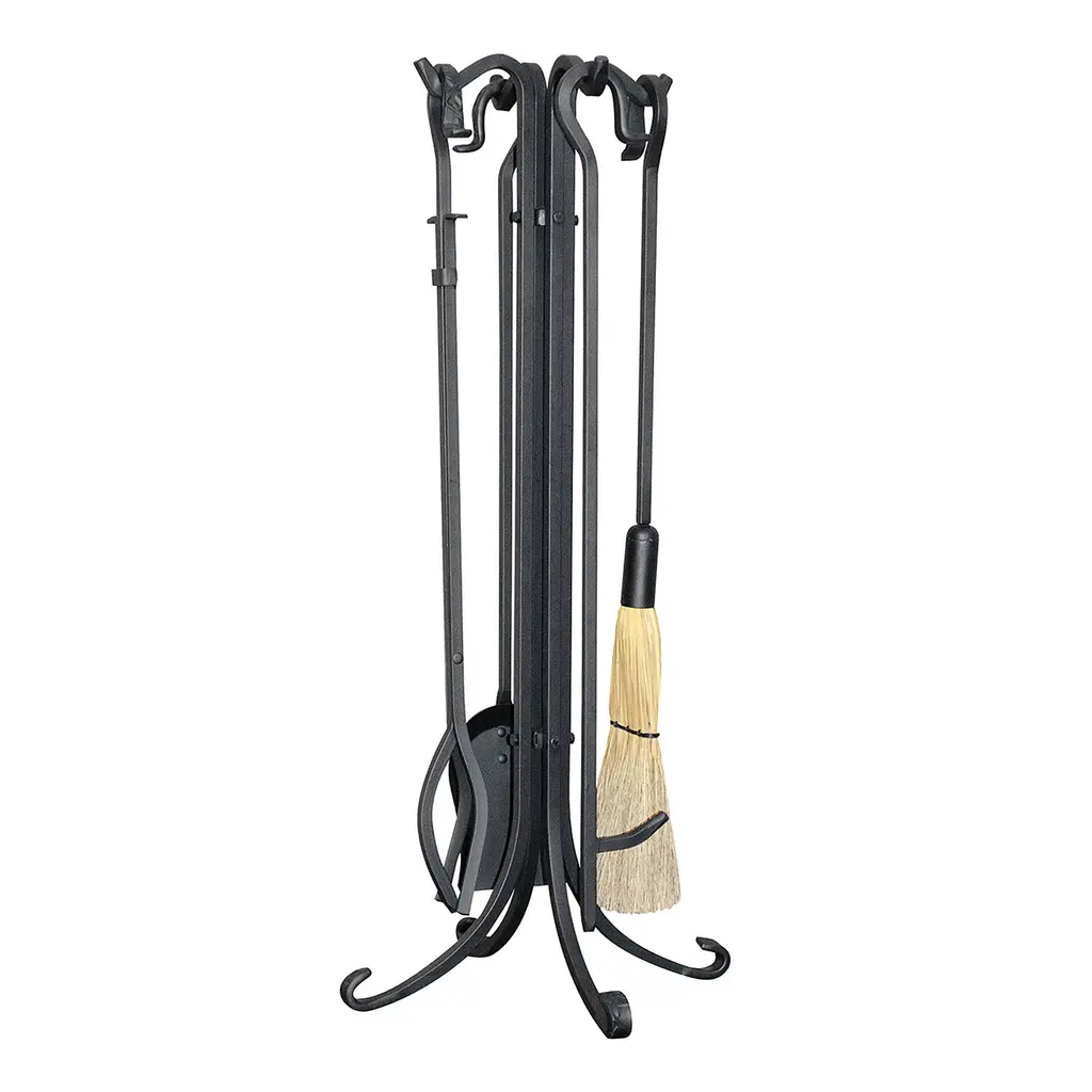 The tools of our Bowed Tool Set hang in a row on classic shepherd's crook handles for easy access. The four-piece set includes a poker, shovel, natural corn broom and sure-grip tongs. Stylish, round-stock stand has an elongated penny foot base for stability. Protective powder-coat finish.