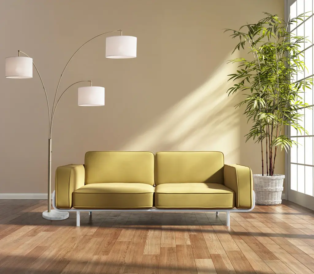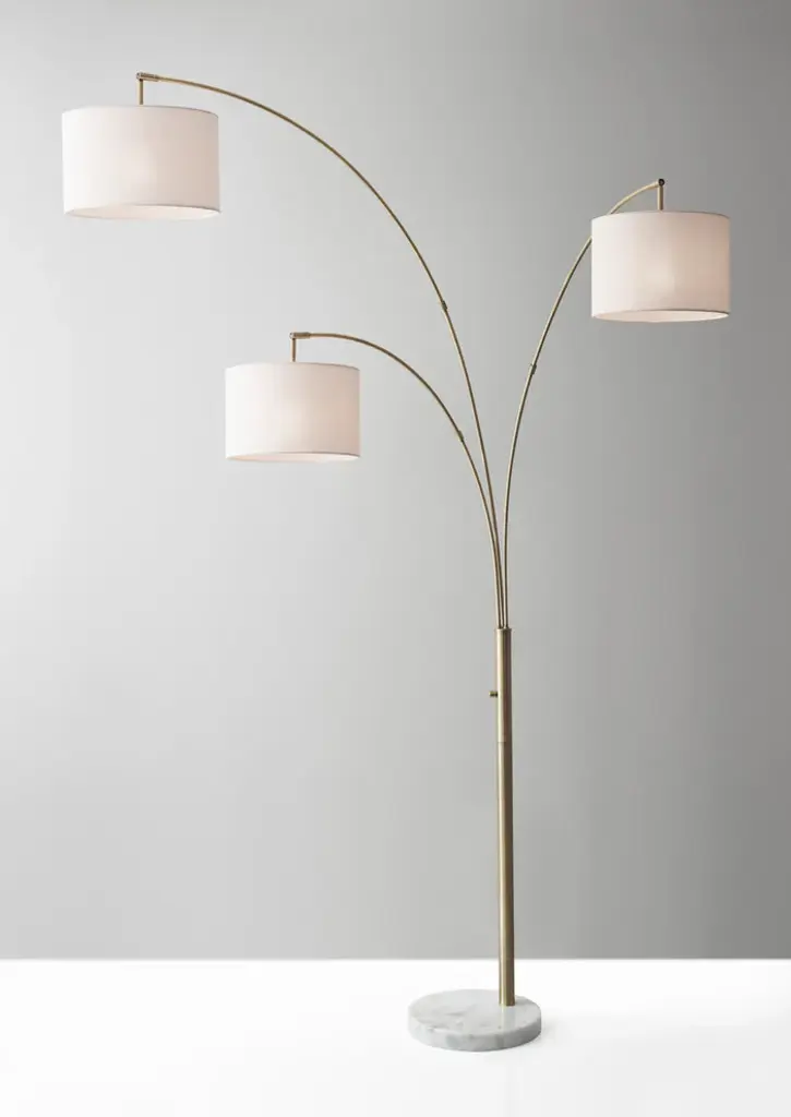 A smart and stylish way to light up a seating area, the Bowery 3-Arm Arc Lamp provides overhead lighting that can be controlled with three adjustable shade arms. An antique brass finish is paired with a white marble base to display striking style. Three 60-watt bulbs shine beautifully through off-white textured fabric shades.Wattage: 180WBulb Type: 3 x 60-watt incandescent or 13-watt CFLBulbs Included: NoSwitch Type: 4-Way Rotary Switch 4-Way: 1 light on, 2 lights on, 3 lights on, offShade Material: Linen