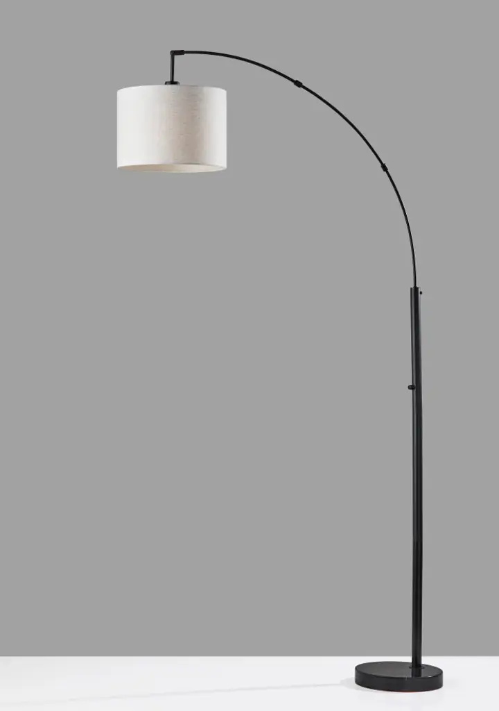 A smart and stylish way to light up a seating area, the Bowery Arc Lamp provides overhead lighting that can be controlled with an adjustable shade. Aside from functional assets, a matte black finish is paired with a black marble base to display striking style. An 100 Watt bulb shines beautifully through a taupe textured fabric shade. This unique mix of materials creates a beautiful, classy look adding modern farmhouse vibes to any home. An on/off rotary switch is placed conveniently on the pole. ETL TestedDry RatedUses: 100W Type A Bulb (Not Included)On/Off Rotary Switch on Tube