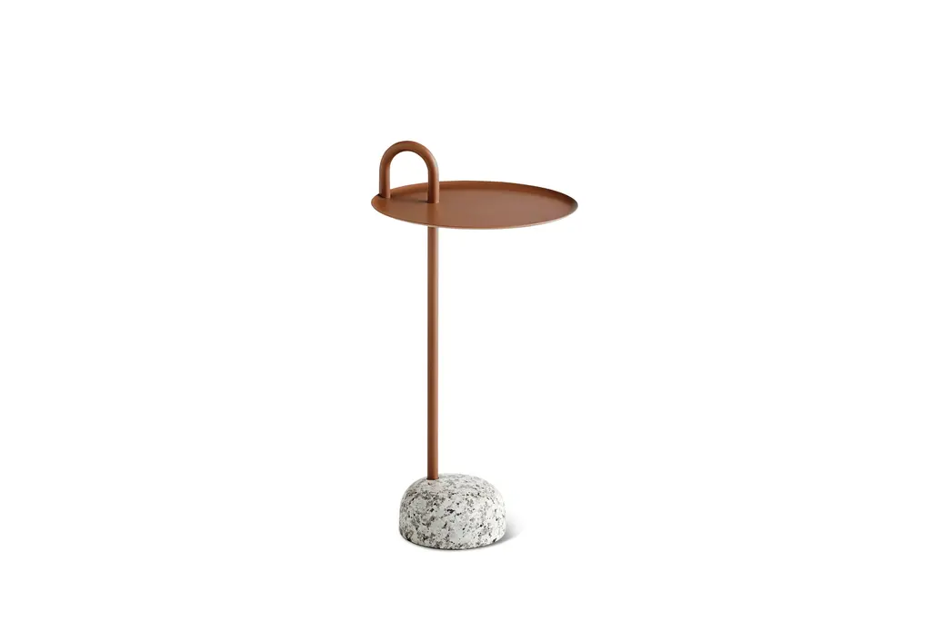 Bowler is a compact side table designed for small spaces. Its single tube support extends upwards from its solid granite base to create a defined profile and a clever, functional semicircular handle. The stem, handle, and tray are made from powder coated steel, making it lightweight enough to move wherever you see fit.